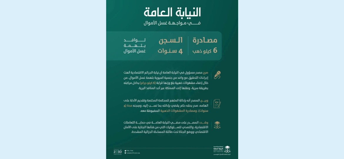 صرح مصدر مسؤول في النيابة العامة أن نيابة الجرائم الاقتصادية أنهت إجراءات التحقيق مع وافد من جنسية آسيوية بتهمة غسل الأموال، من خلال إخفاء مشغولات ذهبية بلغ وزنها قرابة (6 كيلوات) بداخل مركبته بطريقة سرية، ونقلها إلى المملكة عبر أحد المنافذ البرية.