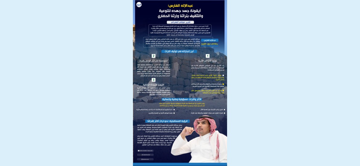 وبجهوده المتواصلة، أصبح عبدالإله الفارس رمزًا للعطاء في مجال الآثار والتراث، فهو ليس مجرد موثقٍ للماضي، بل حارسٌ أمين لذاكرة الوطن. وبينما يواصل رحلته بين أنقاض الحضارات القديمة، يترك وراءه بصمة خالدة، تلهم الأجيال القادمة للسير على خطاه، حفاظًا على هذا الإرث العظيم.