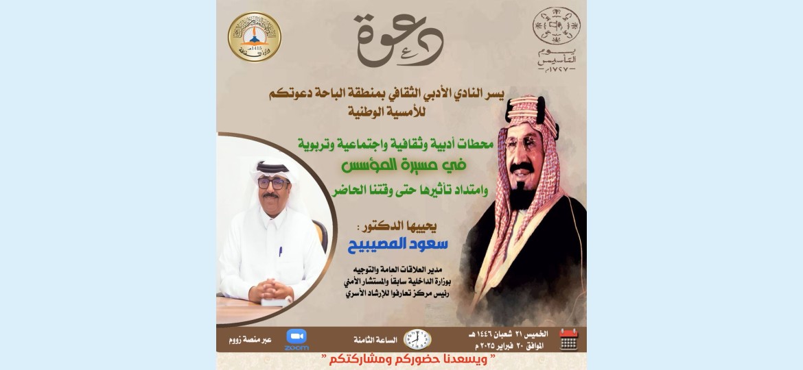 رئيس النادي الشاعر حسن بن محمد الزهراني قال أن هذه الأمسية تتزامن مع احتفالات الوطن بذكرى يوم التأسيس والذي يحتفي فيه النادي الأدبي الثقافي بالباحة كل عام برمز من خلال رموز الوطن الكبيرة وفي هذا العام سيكون الاحتفال مختلفاً فالاحتفال سيكون برمز الرموز الوطنية وموحد المملكة العربية السعودية الملك عبد العزيز بن عبد الرحمن آل سعود طيب الله ثراه من خلال محطات أدبية وثقافية واجتماعية وتربويّة في مسيرة المؤسس وامتداد تأثيرها حتى وقتنا الحاضر، وسوف يتحدث بإسهاب عن هذه المحطات ضيف النادي الكبير الدكتور سعود المصيبيح الساعه الثامنة من مساء يوم الخميس ٢١/ ٨ / ١٤٤٦هـ ، ٢٠ / ٢ / ٢٠٢٥م.