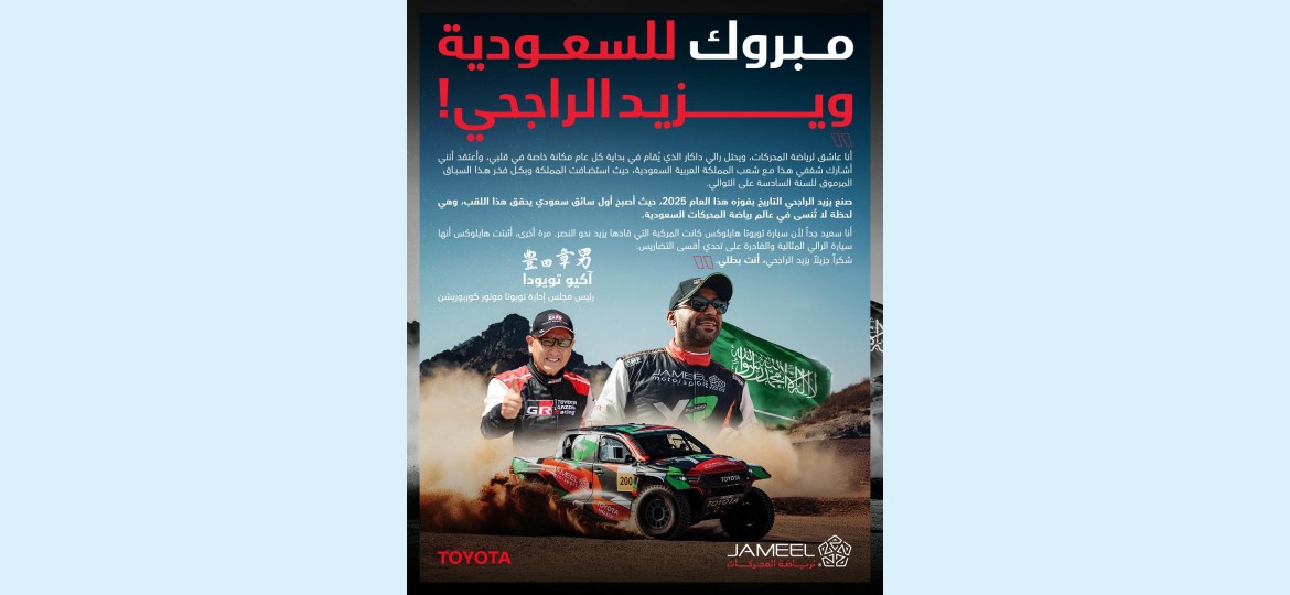 تلقى فريق يزيد ريسنج تهنئة خاصة من السيد أكيو تويودا، رئيس مجلس إدارة تويوتا موتور كوربوريشن، بمناسبة الإنجاز التاريخي الذي حققه السائق السعودي يزيد الراجحي بفوزه بلقب رالي داكار 2025، ليصبح بذلك أول سائق سعودي يتوج بهذا اللقب العالمي المرموق.