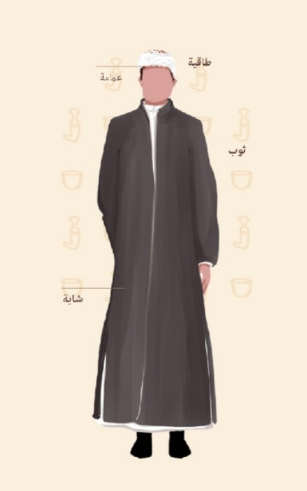 يرتدوا ثوب مصنوع من الكتان والقطن وغالباً يلبسوا طاقية فوقها عمامة سوداء، وفي العادة يكون فوق الثوب جبة فيها نوع بسيط من التطريز وسروال طويل مطرز ايضاً تحت الثوب.