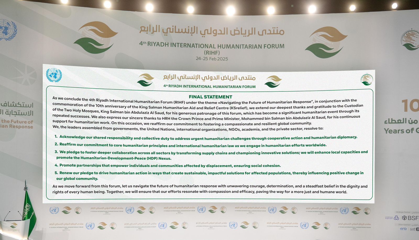ورفع المشاركون في البيان الختامي للمنتدى بالغ الشكر والامتنان لخادم الحرمين الشريفين الملك سلمان بن عبدالعزيز آل سعود ـ حفظه الله ـ على رعايته الكريمة لهذا المنتدى الذي أصبح علامة بارزة من خلال نجاحاته المتكررة، معربين عن شكرهم الجزيل لصاحب السمو الملكي الأمير محمد بن سلمان بن عبدالعزيز آل سعود ولي العهد رئيس مجلس الوزراء ــ حفظه الله ــ على دعمه المتواصل للعمل الإنساني، مجددين التأكيد في هذه المناسبة على التزامهم الراسخ ببناء مجتمع عالمي يعكس قيم الرحمة ويتميز بالقدرة على الصمود.