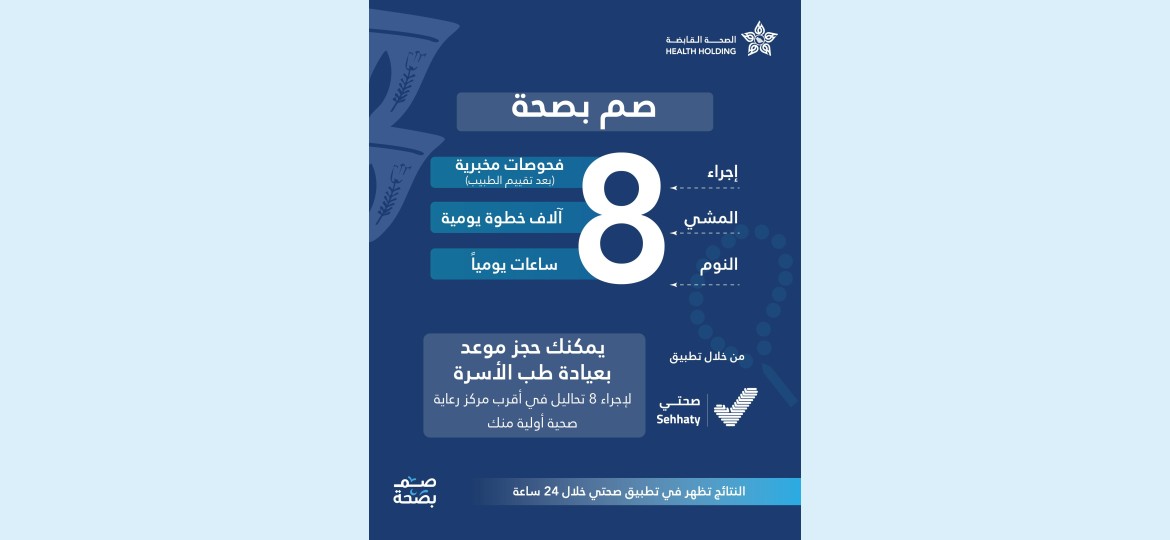 كما تستهدف حملة الصحة القابضة زيادة الوعي حول سبل تحسين سلوك الفرد للحد من تأثير الأمراض المزمنة على حياة الفرد خلال شهر رمضان المبارك، وإجراء فحص الدم لاكتشاف الإصابة بالأمراض مبكرًا وتحديد برنامج العلاج المناسب من خلال الخدمات المتنوعة التي تقدمها مراكز الرعاية الأولية، علاوة على حث أفراد المجتمع على مُمارسة رياضة المشي بما لا يقل عن 8 آلاف خطوة ومتابعة الأداء اليومي عبر تطبيق "صحتي" والمشاركة في تحدي رمضان عبر الرابط: www.health.sa،بالإضافة إلى النوم لساعات كافية لا تقل عن 8 ساعات.