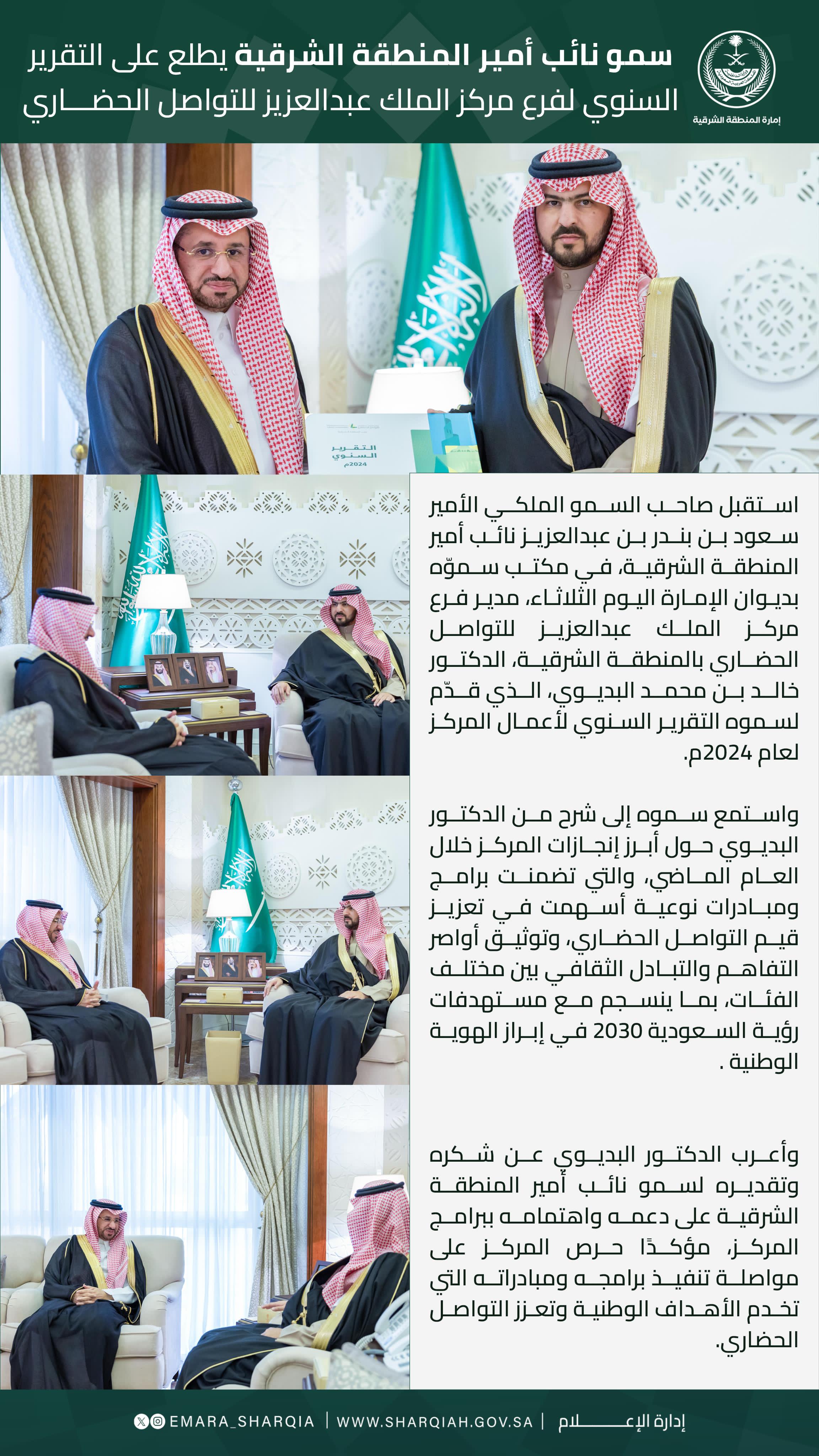 استقبل صاحب السمو الملكي الأمير سعود بن نايف بن عبدالعزيز، أمير المنطقة الشرقية، وصاحب السمو الملكي الأمير سعود بن بندر بن عبدالعزيز، نائب أمير المنطقة الشرقية، في مكتبيهما بديوان الإمارة اليوم الثلاثاء، مدير فرع مركز الملك عبدالعزيز للتواصل الحضاري بالمنطقة الشرقية، الدكتور خالد بن محمد البديوي، الذي قدّم لهما التقرير السنوي لأعمال المركز لعام 2024م.