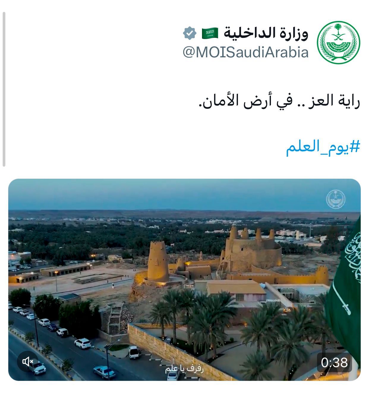 تفاعلت وزارة الداخلية عبر منصاتها بمواقع التواصل الاجتماعي وقطاعاتها مع يوم العلم والذي يصادف الحادي عشر من مارس من كل عام ، تجسيدًا لما توليه القيادة الرشيدة - حفظها الله - من اهتمام برمزية العلم ودلالاته الوطنية المهمة.