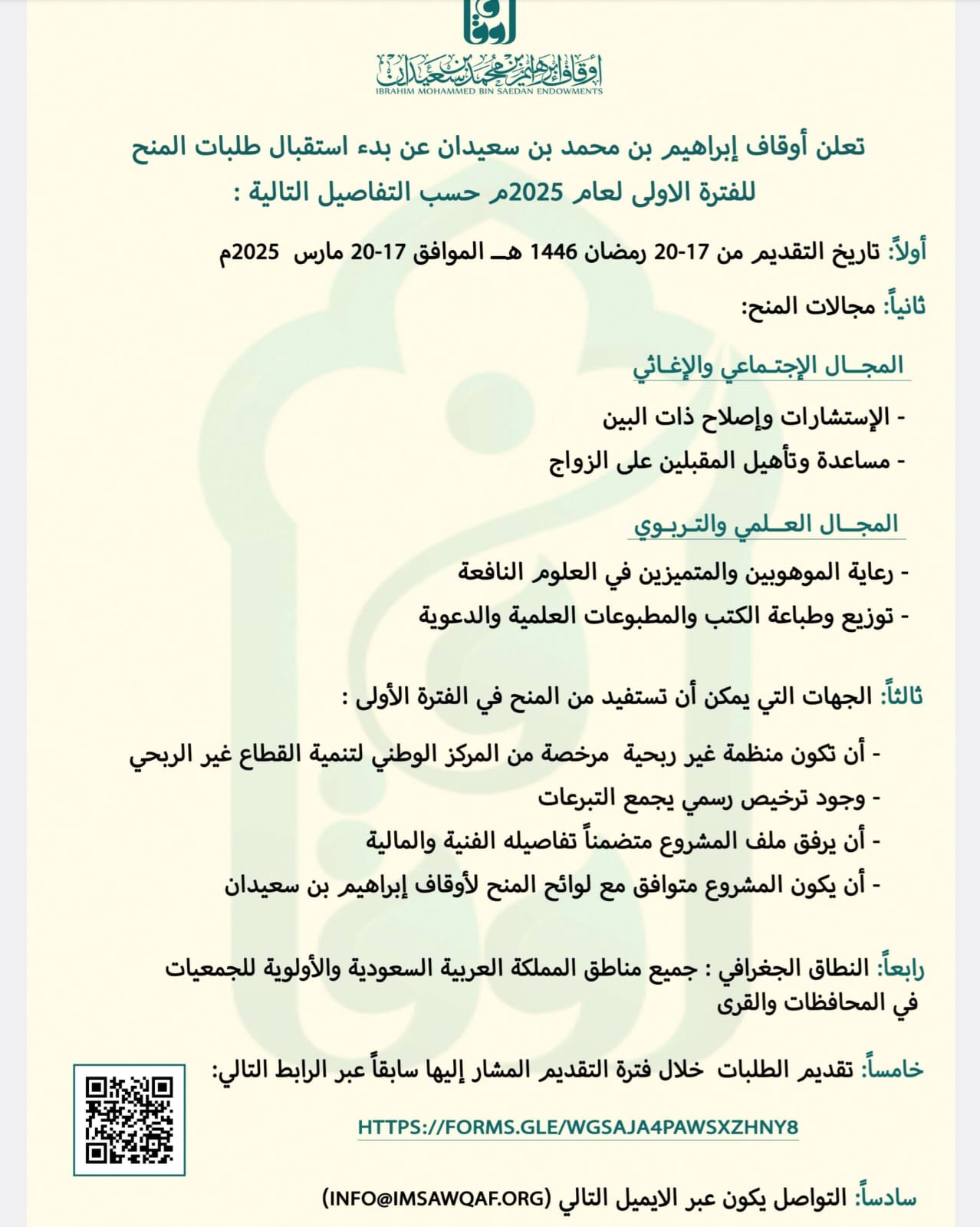 أعلنت أوقاف إبراهيم بن محمد بن سعيدان عن بدء استقبال طلبات المنح للفترة الأولى لعام 2025م، وحددت مجالات المنح للفترة الأولى بمجالين هما مجال دعم المسار الاجتماعي والإغاثي، ومجال دعم البرامج العلمية والتربوية، من أصل سبع مجالات سبق أن حددتها لوائح وأنظمة المنح بأوقاف الشيخ إبراهيم بن سعيدان، حيث سيتم الإعلان في الفترات القادمة عن باقي مجالات المنح.