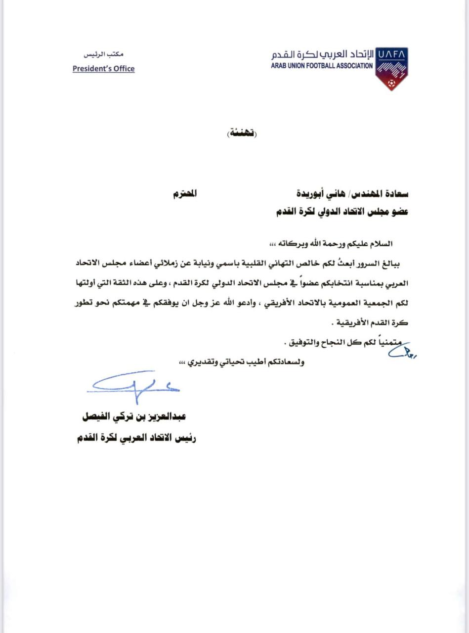 وجاء في خطاب سمو الأمير للمهندس هاني أبو ريدة: "ببالغ السرور أبعث لكم خالص التهاني القلبية باسمي ونيابة عن زملائي أعضاء مجلس الاتحاد العربي بمناسبة انتخابكم عضوا في مجلس الاتحاد الدولي لكرة القدم، وعلى هذه الثقة التي أولتها لكم الجمعية العمومية بالاتحاد الأفريقي، وأدعو الله عز وجل أن يوفقكم في مهمتكم نحو تطور كرة القدم الأفريقية، متمنياً لكم كل النجاح والتوفيق.