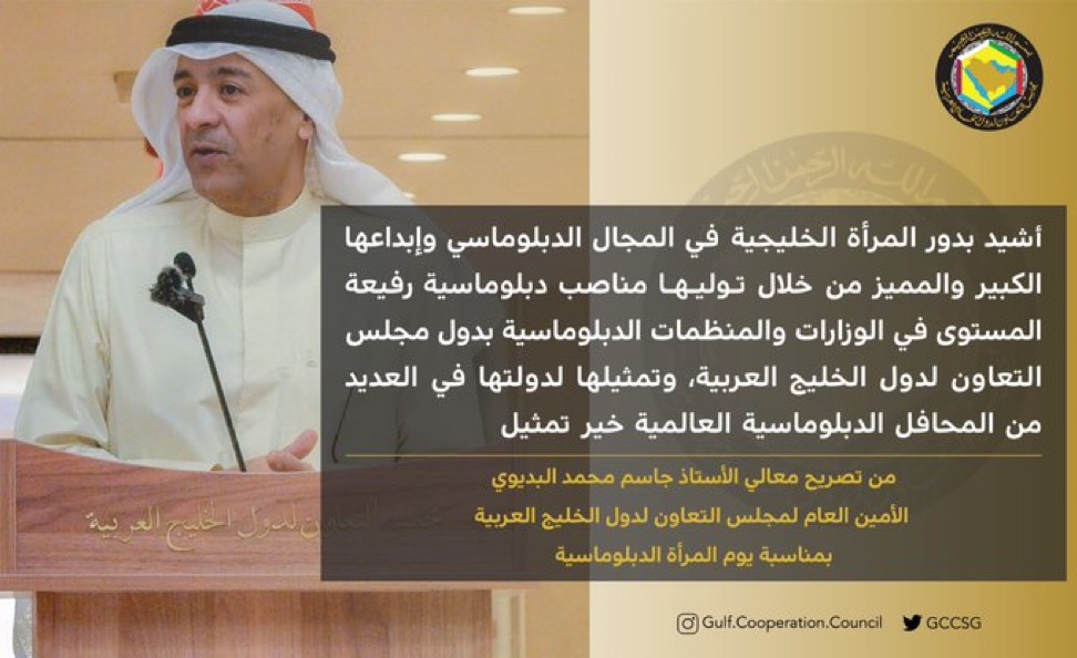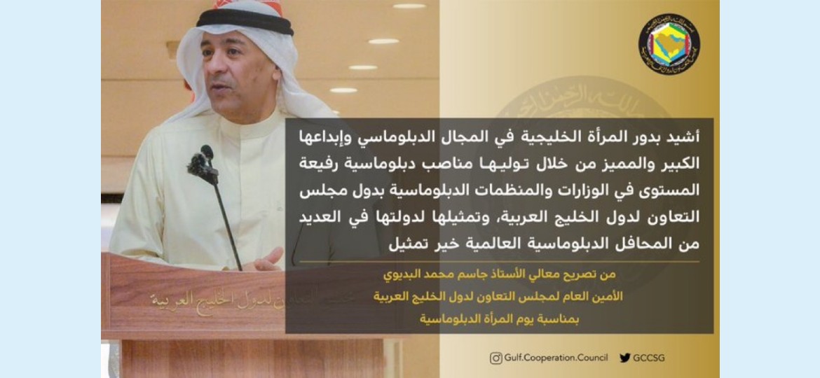 قدم معالي الأستاذ جاسم محمد البديوي، الأمين العام لمجلس التعاون لدول الخليج العربية، خالص التهاني والتبريكات بمناسبة يوم المرأة الدبلوماسية، وجاء ذلك خلال تصريح لمعاليه بمناسبة الاحتفال بيوم المرأة الدبلوماسية، الذي يصادف تاريخ 24 يونيو من كل عام بناء على قرار الجمعية العامة رقم (269/76).