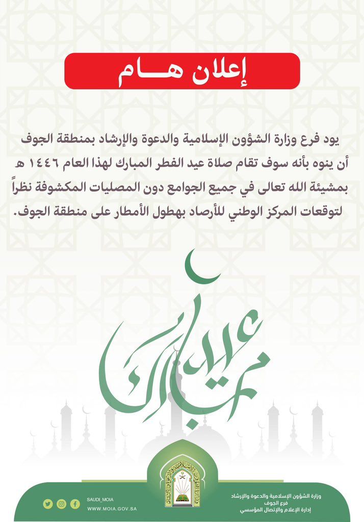 قرر فرع وزارة الشؤون الإسلامية والدعوة والإرشاد بمنطقة الجوف ،بناءً على توقعات المركز الوطني للأرصاد بهطول الأمطار على منطقة الجوف، إقامة صلاة عيد الفطر المبارك لهذا العام ١٤٤٦هـ بالجوامع فقط .