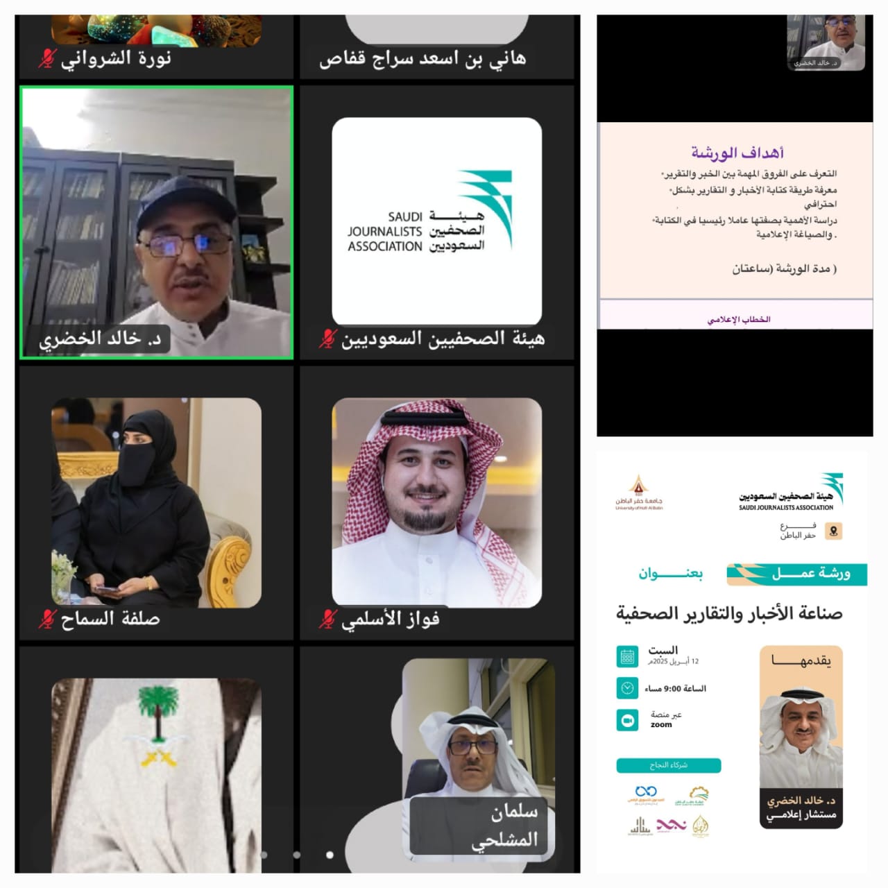 نظم فرع هيئة الصحفيين السعوديين بحفرالباطن، مساء أمس، ورشة عمل تدريبية عبر منصة Zoom بعنوان "صناعة الأخبار والتقارير الصحفية"، قدّمها المستشار الإعلامي الدكتور خالد الخضري، ضمن برنامج "الصحافة الرقمية والإعلام الجديد "، الذي ينفذ بالتعاون بين هيئة الصحفيين السعوديين وجامعة حفرالباطن.