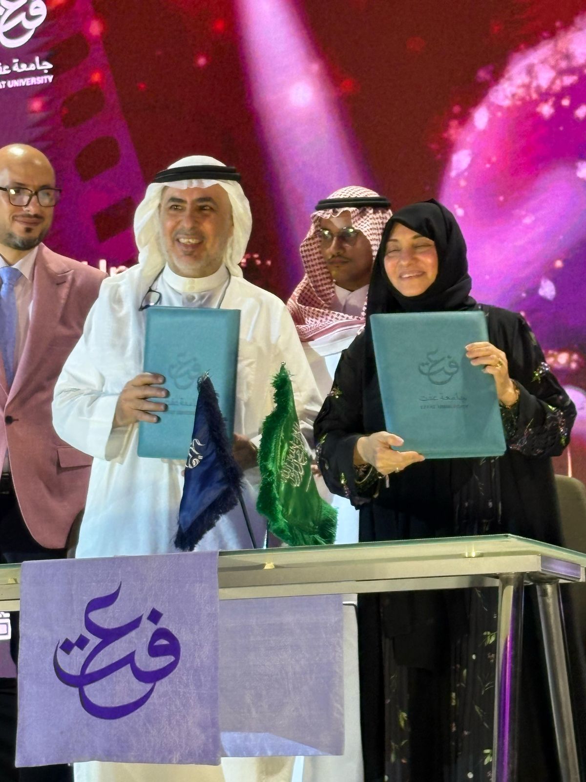 ابرم الاتحاد العام للفنانين العرب في اليوم الختامي لمهرجان عفت السينمائي الدولي لأفلام الطلاب 2025 في نسخته الـ12 عقداً وقع على بنوده الدكتور عمر الجاسر الامين العام للاتحاد مع رئيسة الجامعة الدكتورة هيفاء جمل الليل ، وشهدت منصة الحفل الذي رعته صاحبة السمو الملكي الأميرة لولوة الفيصل مراسم هذا التوقيع وسط حضور كبير من الفنانين والمبدعين والمختصين في المجال.. و أبدى المخرج الجاسر سعادته بالتوقيع مع جامعة عفت الرائدة في تعليم فنون السينما وخرجت العديد من المبدعين والمبدعات الذين اصبح لهم أثر في تطور السينما السعودية وحسب توجيهات الاستاذ مسعد فوده رئيس اتحاد الفنانين العرب ونقيب السينمائيين المصريين سيتم توثيق التعاون مع الجامعه ودعمها الكوادر الفنية المتخصصة المحترفة من كافة ارجاء الوطن العربي تحقيقاً لرؤية الاتحاد التكامل الفني والثقافي بين الدول العربية.