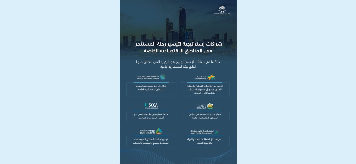 وتضمنت الشراكات اتفاقيات مع وزارة العدل والمركز السعودي للتحكيم التجاري، لإنشاء منظومة تحكيم ومصالحة متقدمة داخل المناطق الاقتصادية الخاصة، إضافة إلى تعاون مع هيئة الزكاة والضريبة والجمارك ووزارة الموارد البشرية والتنمية الاجتماعية لتقديم حوافز تشمل إعفاءات ضريبية وجمركية، وتسهيل إصدار التأشيرات، والإعفاء من المقابل المالي للكوادر الأجنبية.