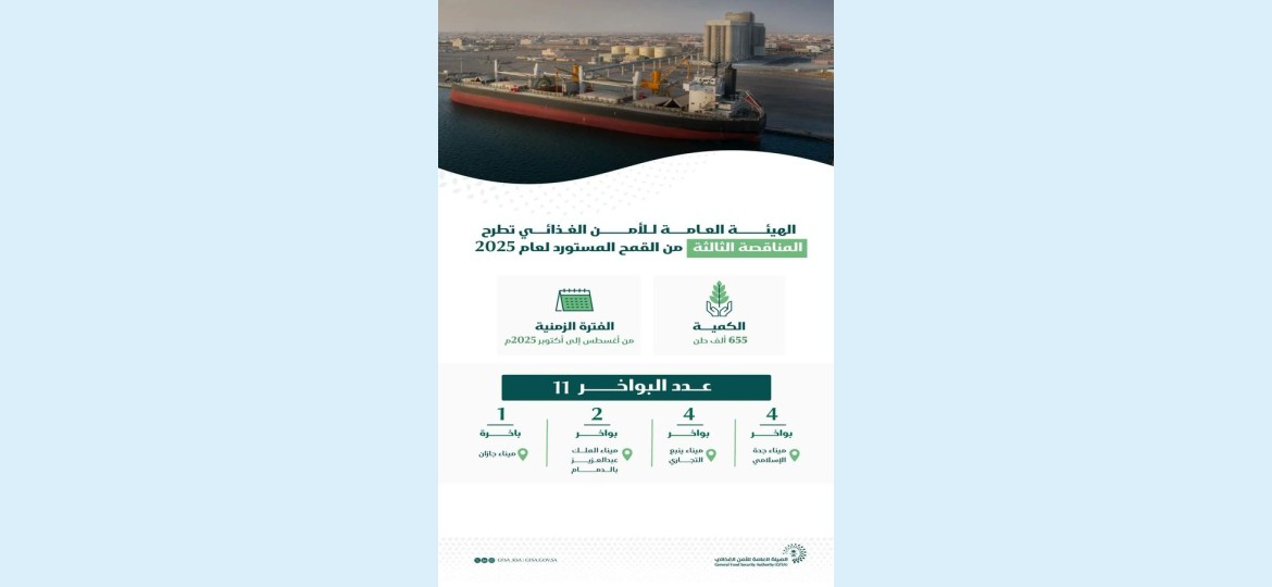 أعلنت الهيئة العامة للأمن الغذائي، اليوم، طرح المناقصة الثالثة لاستيراد القمح لعام 2025، وذلك لكمية (655) ألف طن للتوريد خلال الفترة (أغسطس – أكتوبر 2025م).
