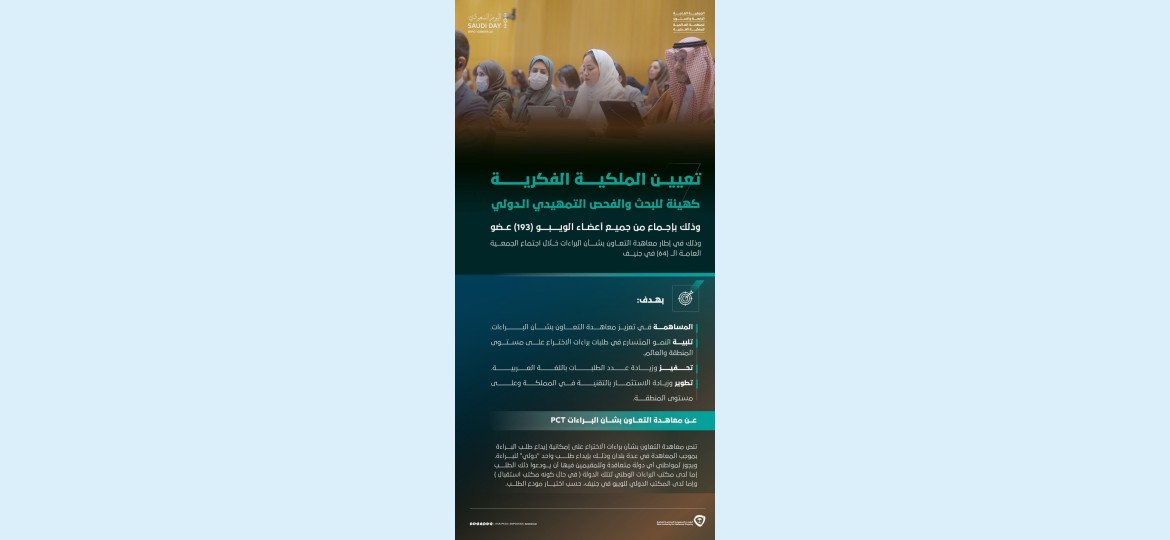 أعلنت المنظمة العالمية للملكية الفكرية، اعتماد تعيين الهيئة السعودية للملكية الفكرية هيئةً للبحث والفحص التمهيدي الدولي، وذلك في إطار معاهدة التعاون بشأن براءات الاختراع (PCT/ISA/IPEA)، كثاني مكتب بحث وفحص دولي يدعم اللغة العربية.