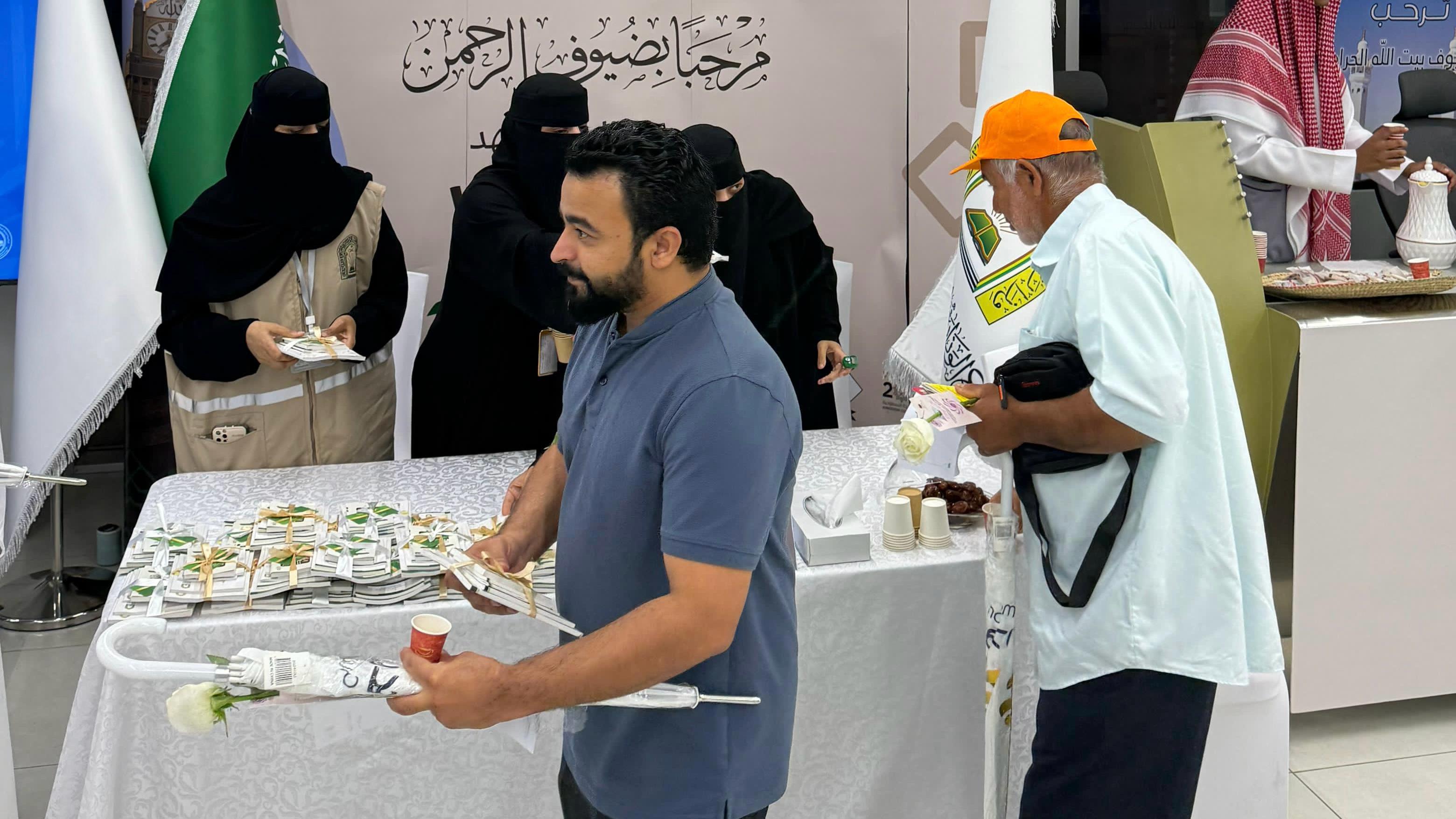 وقدّم منسوبو ومنسوبات الوزارة المشاركون في الاستقبال القهوة السعودية والتمور ومجموعة مختارة من الحلويات، في مشهد يجسّد الكرم السعودي الأصيل ويُعبّر عن التقدير الكبير لضيوف الرحمن منذ لحظة وصولهم.