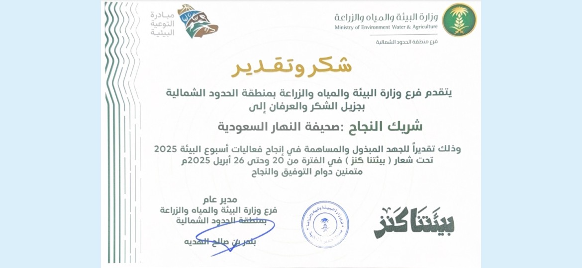 تقدم فرع وزارة البيئة والمياه والزراعة بمنطقة الحدود الشمالية بخالص الشكر والتقدير إلى صحيفة النهار السعودية، اعترافًا بالجهود المباركة والمساهمة الفاعلة التي قدمتها الصحيفة في إنجاح أعمال ومبادرات الفرع.