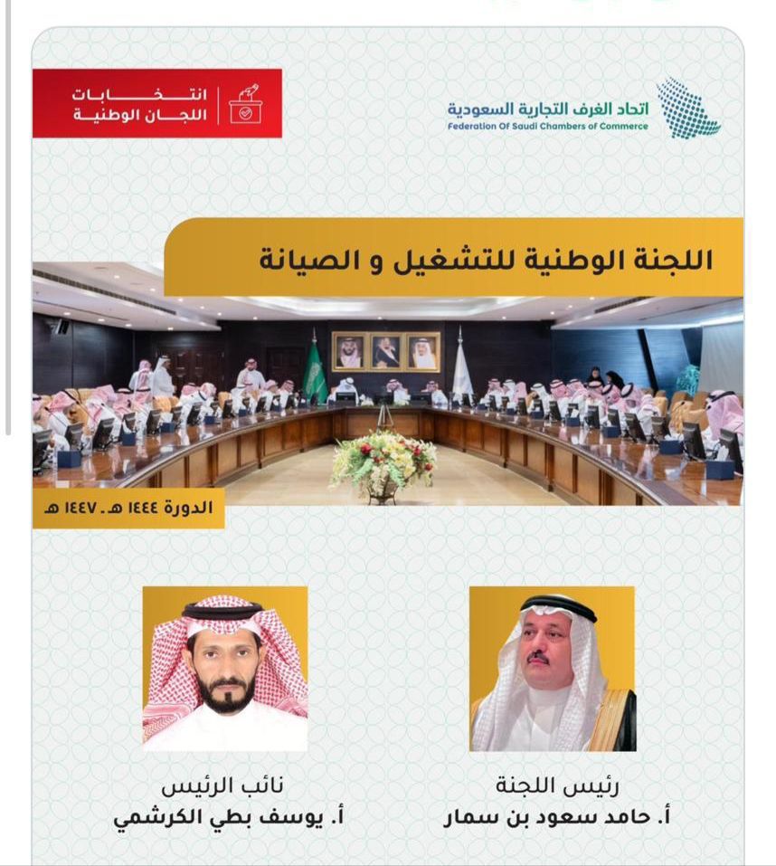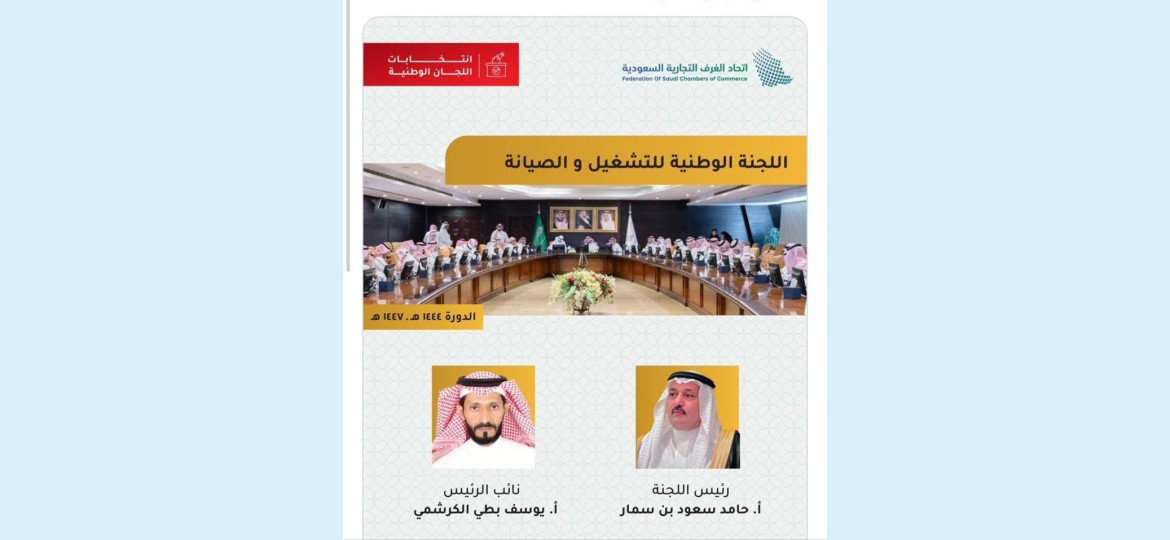 أعلن اتحاد الغرف السعودية عن تشكيل اللجنة الوطنية للتشغيل والصيانة للدورة (1444 – 1447هـ)، وانتخاب الأستاذ حامد سعود بن سمار رئيسًا للجنة، والأستاذ يوسف بطي الكرشمي نائبًا للرئيس.