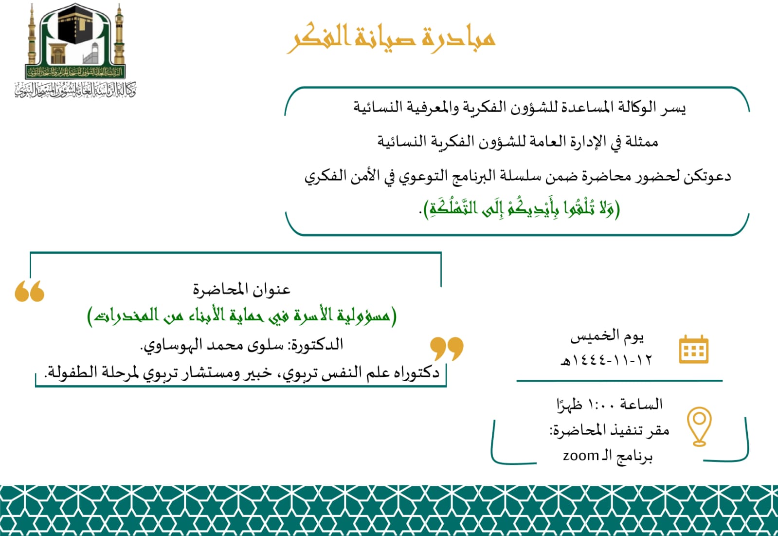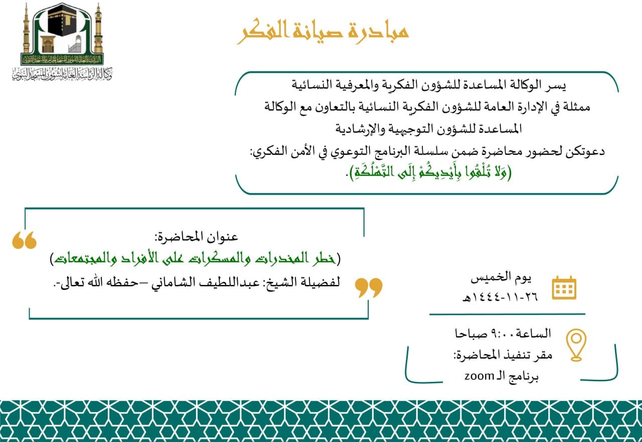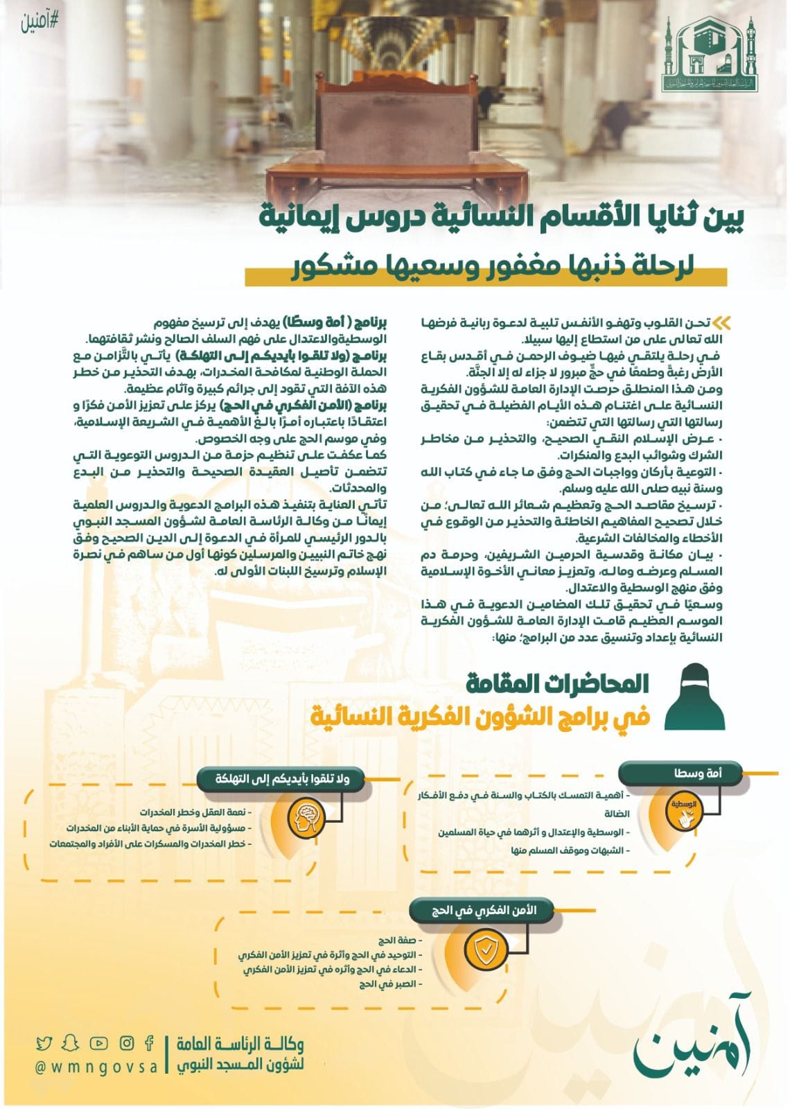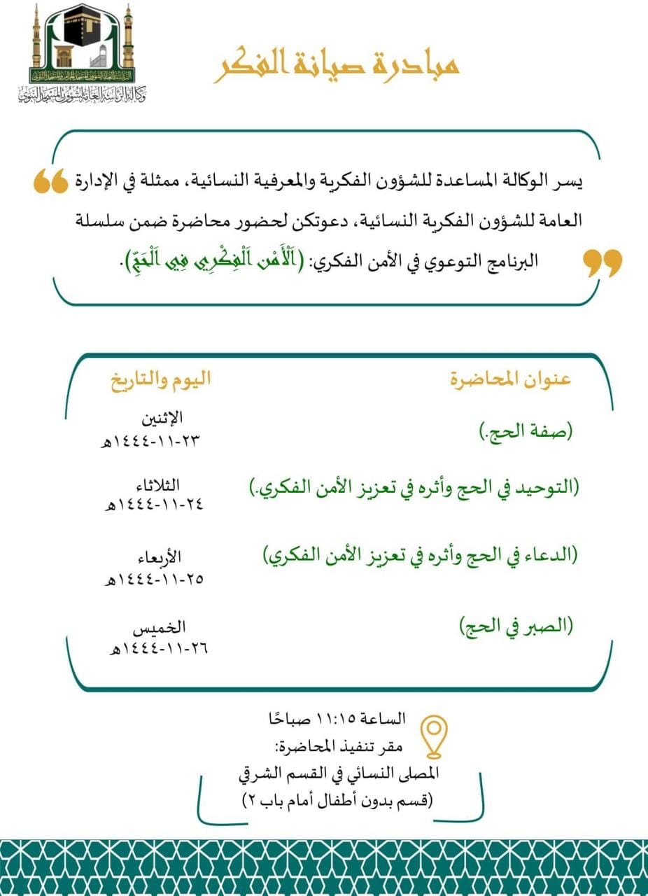 وكالة الرئاسة العامة لشؤون المسجد النبوي ممثلة في الوكالة المساعدة للشؤون الفكرية والمعرفية النسائية نفذت حزمة من البرامج التوعوية والدروس العلمية ضمن مبادرة صيانة فكر المعتمدة من أمارة منطقة المدينة المنورة في خطة موسم الحج لعام ١٤٤٤هـ .
