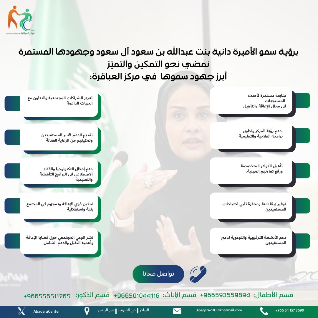 علما أن التسجيل للسعوديين سيكون مجاني و ذلك من خلال البوابة الإلكترونية لوزارة الموارد البشرية و التنمية الاجتماعية من خلال الرابط ( ESERVICES.MTSD.GOV.SA-#-) هذا و برؤية سمو الأميرة دانية بنت عبد الله بن سعود آل سعود و جهودها المستمرة للمضي نحو التمكين و التميز و التي من أبرز جهودها في مركز العباقرة المتايعة المستمرة لأحدث المستجدات في مجال الرعاية و التأهيل ، دعم رؤية المركز و تطوير برامجه العلاجية و التعليمية ، و تأهيل الكوادر المتخصصة و رفع كفاءتهم المهنية و توفير بيئة آمنة و محفزة تلبي احتياجات المستفيدين و دعم الأنشطة الترفيهية و التوعوية لدمجهم و تعزيز الشراكات المجتمعية و التعاون مع الجهات الداعمة و تقديم الدعم لأسر المستفيدين و تمكينهم من الرعاية الفعالة .