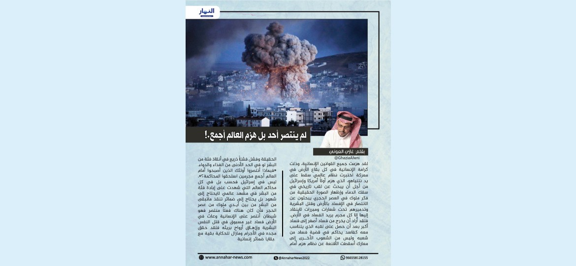 لقد هزمت جميع القوانين الإنسانية، وذلت كرامة الإنسانية في كل بقاع الأرض في معركة اختبرت نظام عالمي سقط على يد نتنياهو، الذي هزم أولاً أمريكا وإسرائيل من أجل أن يبحث عن لقب تاريخي في سفك الدماء وإظهار الصورة الحقيقية من فكر ملوك في العصر الحجري يبحثون عن الانتصار في الإفساد بالأرض وقتل البشرية وتدميرهم تحت شعارات ومبررات لاينقاد إليها إلا كل مجرم يريد الفساد في الأرض.