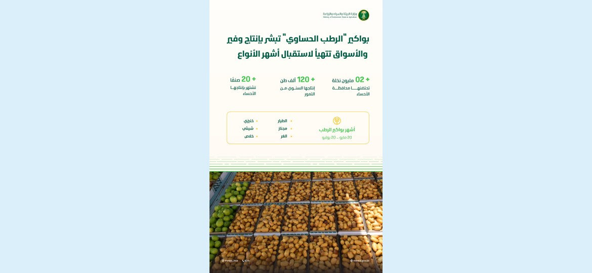تشهد محافظة الأحساء تباشير جني المزارعين لبواكير الرطب مع مطلع فصل الصيف وارتفاع درجات الحرارة، خلال الفترة من (20 مايو – 20 يوليو 2025م)، حيث بدأت أسواق المملكة تتهيأ لاستقبال أكثر من (20) صنفًا من أشهر أنواع الرطب التي تنتجها المحافظة، وتتصدرها (الخلاص، الشيشي، الغر).