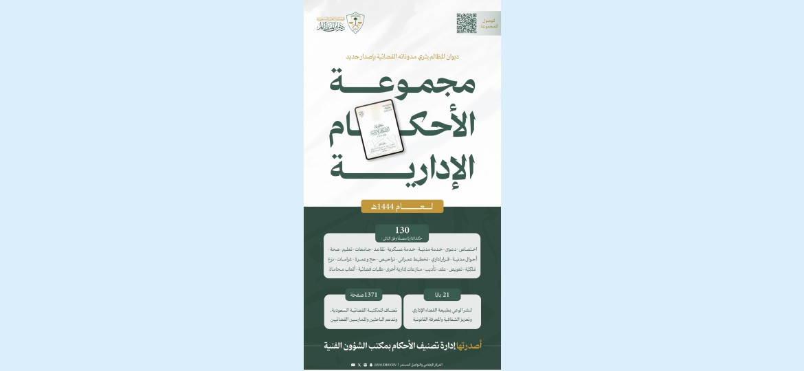 أعلن ديوان المظالم ممثلًا في إدارة تصنيف الأحكام بمكتب الشؤون الفنية، عن إصدار مجموعة الأحكام الإدارية لعام 1444هـ عبر بوابته الرقمية، وتضم هذه المجموعة ما تم اعتماده وتصنيفه من الأحكام الصادرة عن دوائر الاستئناف في محاكم القضاء الإداري بمختلف مناطق المملكة، باختلاف تصنيفاتها ووقائعها وما صدر بشأنها من أحكام.