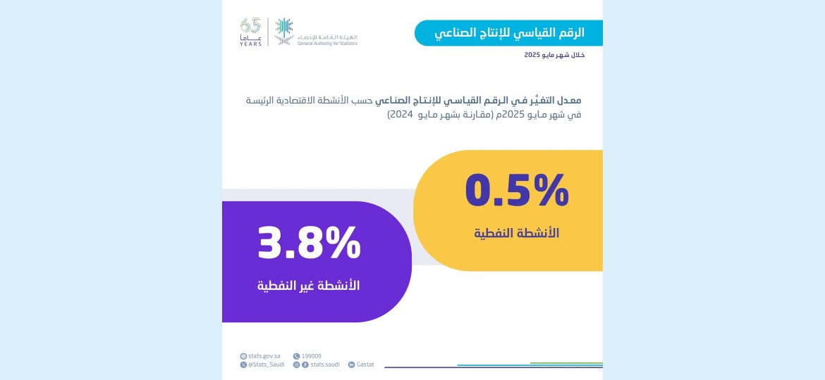 ارتفع مؤشر الرقم القياسي لكميات الإنتاج الصناعي بنسبة (1.5%) خلال شهر مايو من عام (2025م) مقارنةً بالشهر المماثل من العام السابق في مايو (2024م)، مدعومًا بارتفاع نشاط التعدين واستغلال المحاجر، ونشاط الصناعة التحويلية، ونشاط إمدادات المياه، وأنشطة الصرف الصحي، وإدارة النفايات ومعالجتها، وذلك وفقًا لنشرة الرقم القياسي للإنتاج الصناعي الصادرة من الهيئة العامة للإحصاء.
