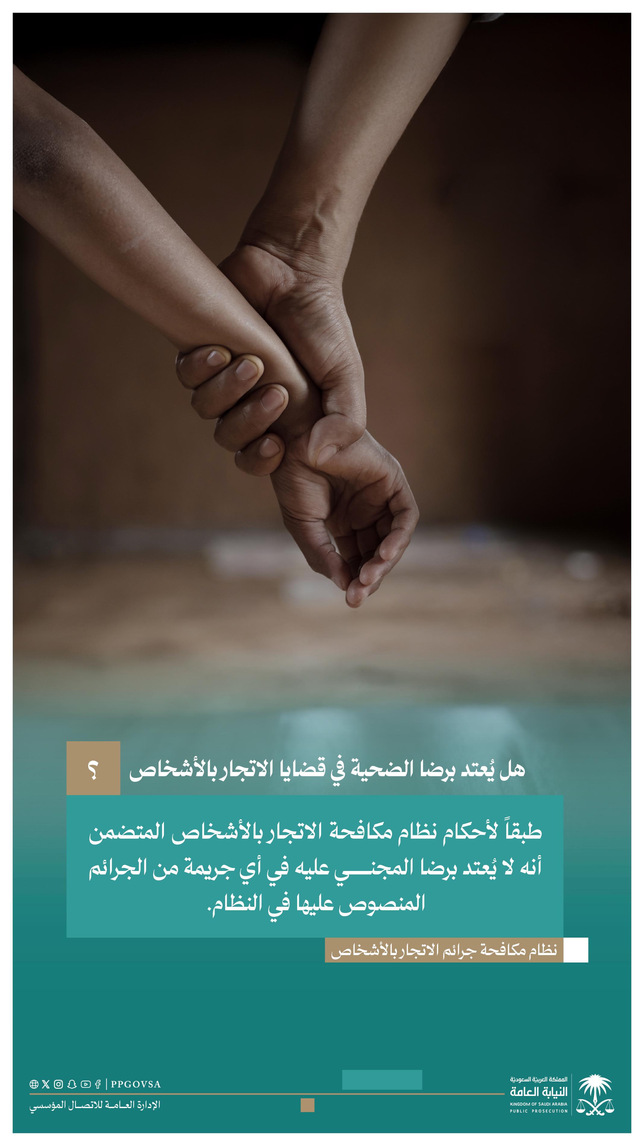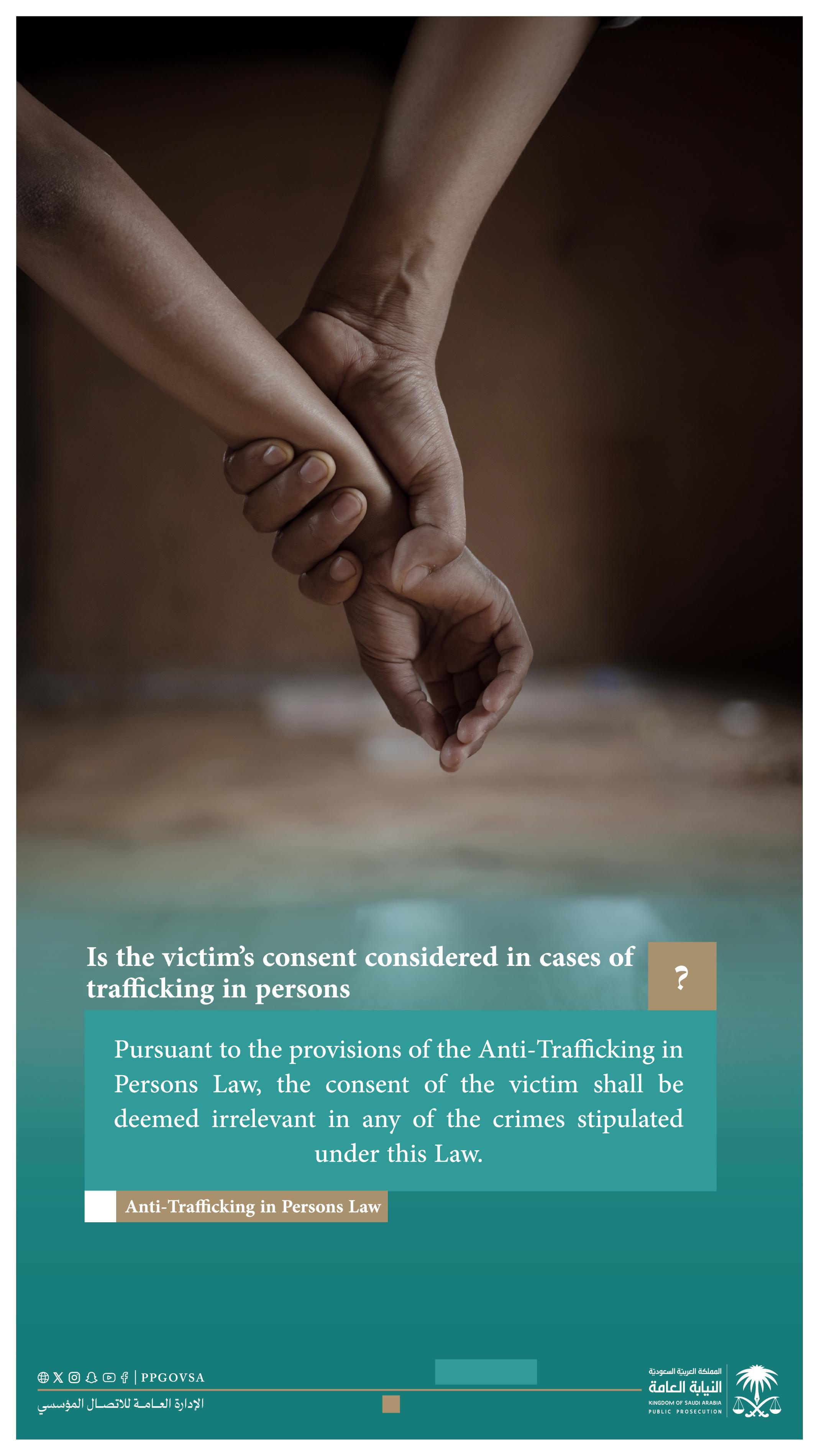 أكدت النيابة العامة أن رضا الضحية لا يُعد مبرراً أو عذراً قانونياً في قضايا الاتجار بالأشخاص، موضحةً أن النظام ينص صراحة على عدم الاعتداد برضا المجني عليه في أي من الجرائم المنصوص عليها.