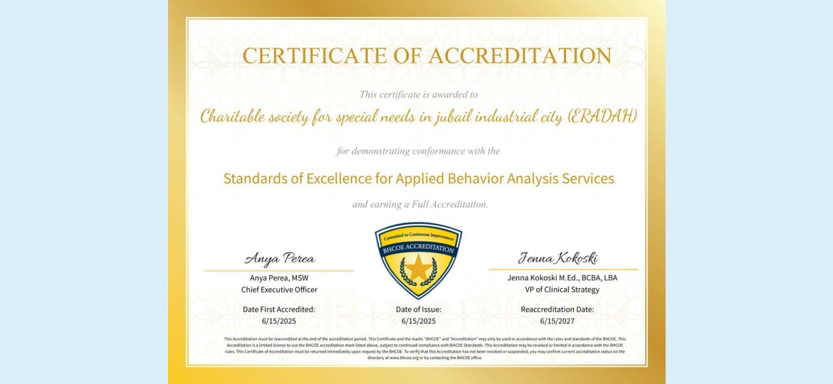 حصلت الجمعية الخيرية لذوي الاحتياجات الخاصة بالجبيل الصناعية "إرادة" على اعتماد (BHCOE) وهي إحدى الجهات الرائدة في مجال تقييم أداء المؤسسات والمراكز التي تُعنى بتقديم الخدمات التأهيلية وخدمات العلاج السلوكي على نحو خاص، وتقييم مدى التكامل في تقديم الخدمات التأهيلية الشاملة كخدمات العلاج الوظيفي وخدمات النطق والتواصل، وتقييم مدى الالتزام بمعايير الجودة.