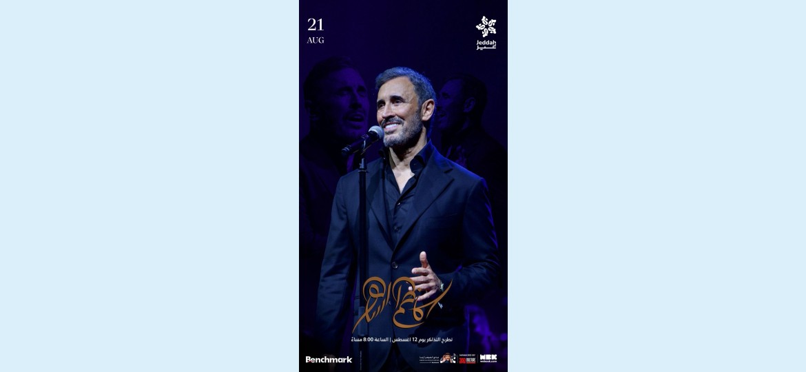في أمسية طال انتظارها، يطل قيصر الغناء العربي كاظم الساهر على جمهوره في جدة يوم الخميس 21 أغسطس 2025، على مسرح عبادي الجوهر ارينا، ضمن برنامج حفلات موسم جدة، بتنظيم من شركة بنش مارك.