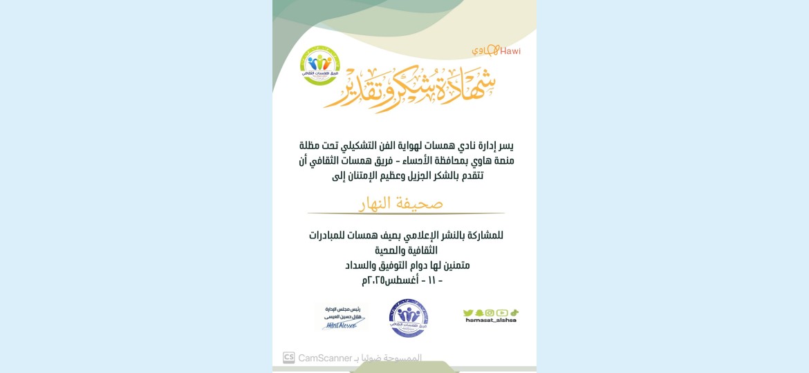 قدمت إدارة نادي همسات لهواية الفن التشكيلي، التابع لمنصة هاوي بمحافظة الأحساء، شهادة شكر وتقدير لـ"صحيفة النهار"، اعترافًا بدورها الفعال ومشاركتها الإعلامية المميزة في تغطية فعاليات "صيف همسات" للمبادرات الثقافية والصحية.