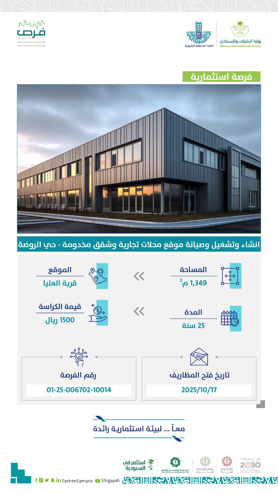 وأوضح رئيس بلدية محافظة قرية العليا الدكتور أحمد بن غرم الله الغامدي أن هذه الفرص تأتي ضمن إستراتيجية البلدية الرامية إلى تشجيع المستثمرين، وتنويع مجالات الاستثمار، ورفع كفاءة استغلال الأراضي والمرافق البلدية، بما يواكب مستهدفات رؤية المملكة 2030 في تعزيز الشراكة مع القطاع الخاص وتحقيق التنمية المستدامة التي تنعكس إيجابًا على جودة الحياة في المحافظة