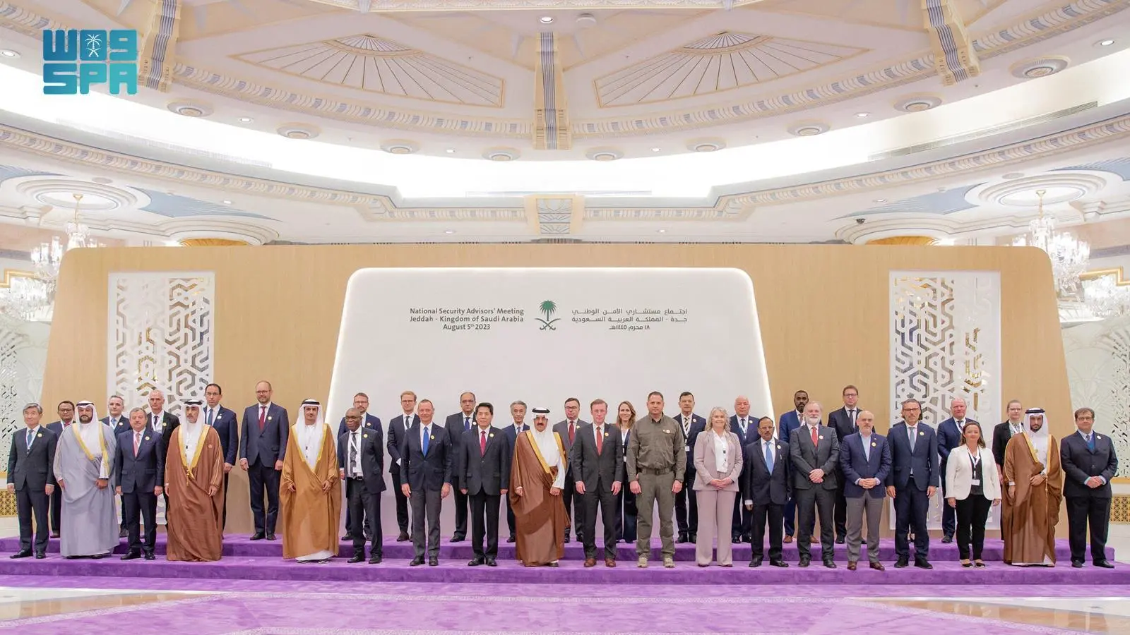 عقد يوم السبت بتاريخ 18 محرم 1445هـ، الموافق 5 أغسطس 2023م، في جدة اجتماع لمستشاري الأمن الوطني وممثلين لأكثر من أربعين دولة ومنظمة دولية، بما في ذلك الأمم المتحدة، برئاسة معالي وزير الدولة عضو مجلس الوزراء مستشار الأمن الوطني الدكتور مساعد بن محمد العيبان، وقد عبر المشاركون عن شكرهم وتقديرهم لقيادة المملكة العربية السعودية للدعوة لهذا الاجتماع واستضافته.