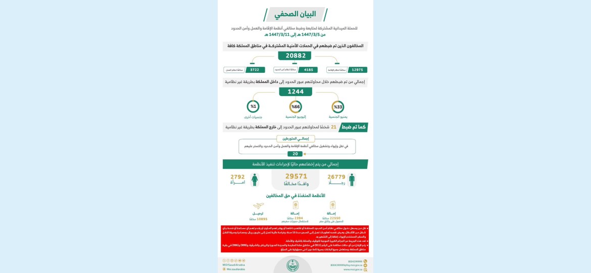 أسفرت الحملات الميدانية المشتركة لمتابعة وضبط مخالفي أنظمة الإقامة والعمل وأمن الحدود، التي تمت في مناطق المملكة كافة، وذلك للفترة من 5 حتى 11 / 3 / 1447هـ الموافق من 28 / 8 حتى 3 / 9 / 2025م عن النتائج التالية: