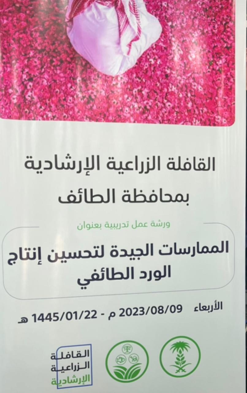مع انطلاق فعاليات أكبر قافلة زراعية إرشادية على مستوى العالم والتي ستجوب 27 مدينة بالمملكة أقام مصنع القرشي للعطور بالهدا اليوم ورشة الممارسات الجيدة لتحسين إنتاج الورد الطائفي ضمن فعاليات القافلة الزراعية الارشادية قبل انطلاقها غدا بمحافظة الطائف والتي ستشتمل على مسيرة بالهجن والسيارات الرسمية احتفاء بوصول القافلة الزراعية الارشادية لمحافظة الطائف وتأكيدًا على أهمية دورها في تنمية القطاع الزراعي بالمحافظة بحضور مدير مكتب وزارة البيئة والمياه والزراعة بمحافظة الطائف المهندس هاني القاضي وعدد من المسؤولين والوجهاء والمختصين بالورد الطائفي