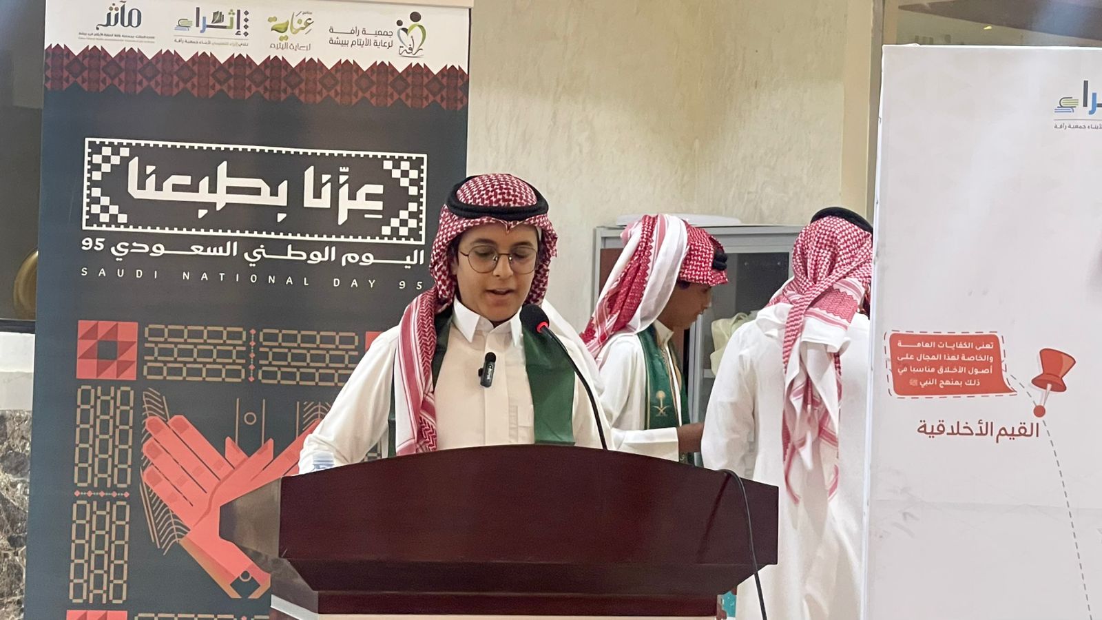 شهدت جمعية رأفة لرعاية الأيتام بمحافظة بيشة، وفي نادي إثراء التعليمي التابع للجمعية، أجواءً متقدة بالفرح وحب الوطن، حيث احتفل أبناء نادي إثراء باليوم الوطني الـ95 تحت شعار "عزنا بطبعنا".