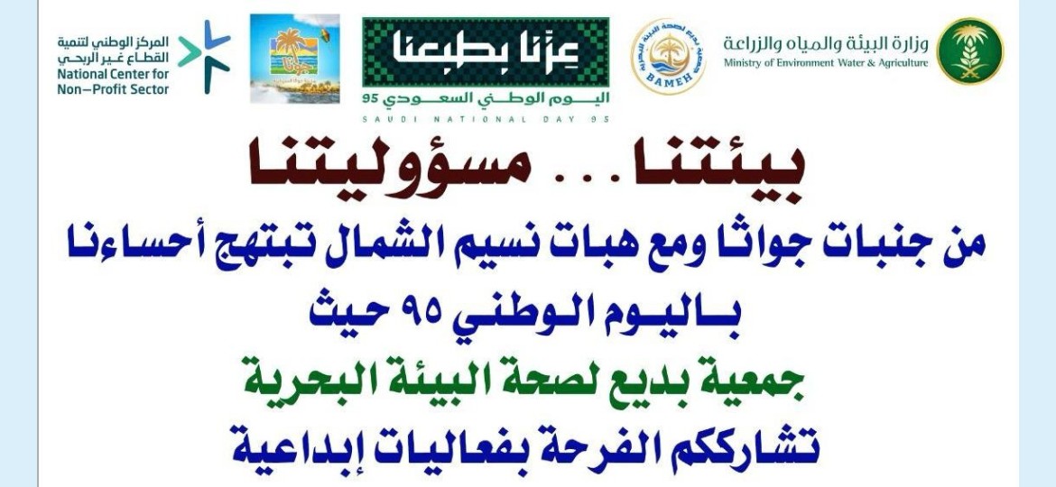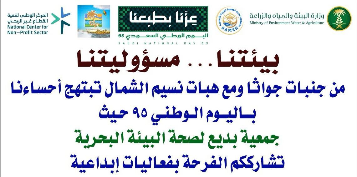 انطلاقا ً من رسالتها بتقديم خدمات إنسانية واجتماعية، جسّدت جمعية بديع لصحة البيئة البحرية مؤخراً مناسبة اليوم الوطني تجسيدا ً معنوياً ، وذلك بغرس وتوزيع ما يقارب 300 شتلة زراعية بمراسيم الحفل بمدينة جواثا السياحية بالأحساء.