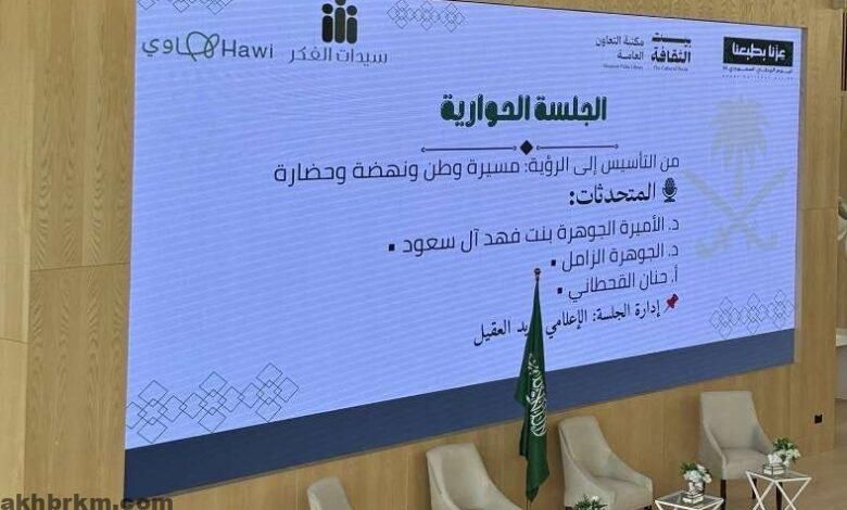 برعاية صاحبة السمو الدكتورة الجوهرة بنت فهد آل سعود، نظم نادي سيدات الفكر مساء الخميس جلسة حوارية بمناسبة اليوم الوطني الـ 95 تحت عنوان: «من التأسيس إلى الرؤية: مسيرة وطن ونهضة وحضارة»، وذلك في بيت الثقافة بالرياض.