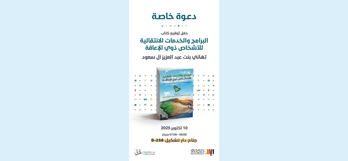 تستعد صاحبة السمو الأميرة تهاني بنت عبدالعزيز بن عبدالرحمن بن مشاري آل سعود لتوقيع كتابها الجديد بعنوان "البرامج والخدمات الانتقالية للأشخاص ذوي الإعاقة في ضوء رؤية المملكة العربية السعودية 2030"، وذلك يوم الجمعة 10 أكتوبر 2025، في جناح دار تشكيل B-258، من الساعة 6:00 إلى 7:00 مساءً، ضمن فعاليات معرض الرياض الدولي للكتاب 2025.