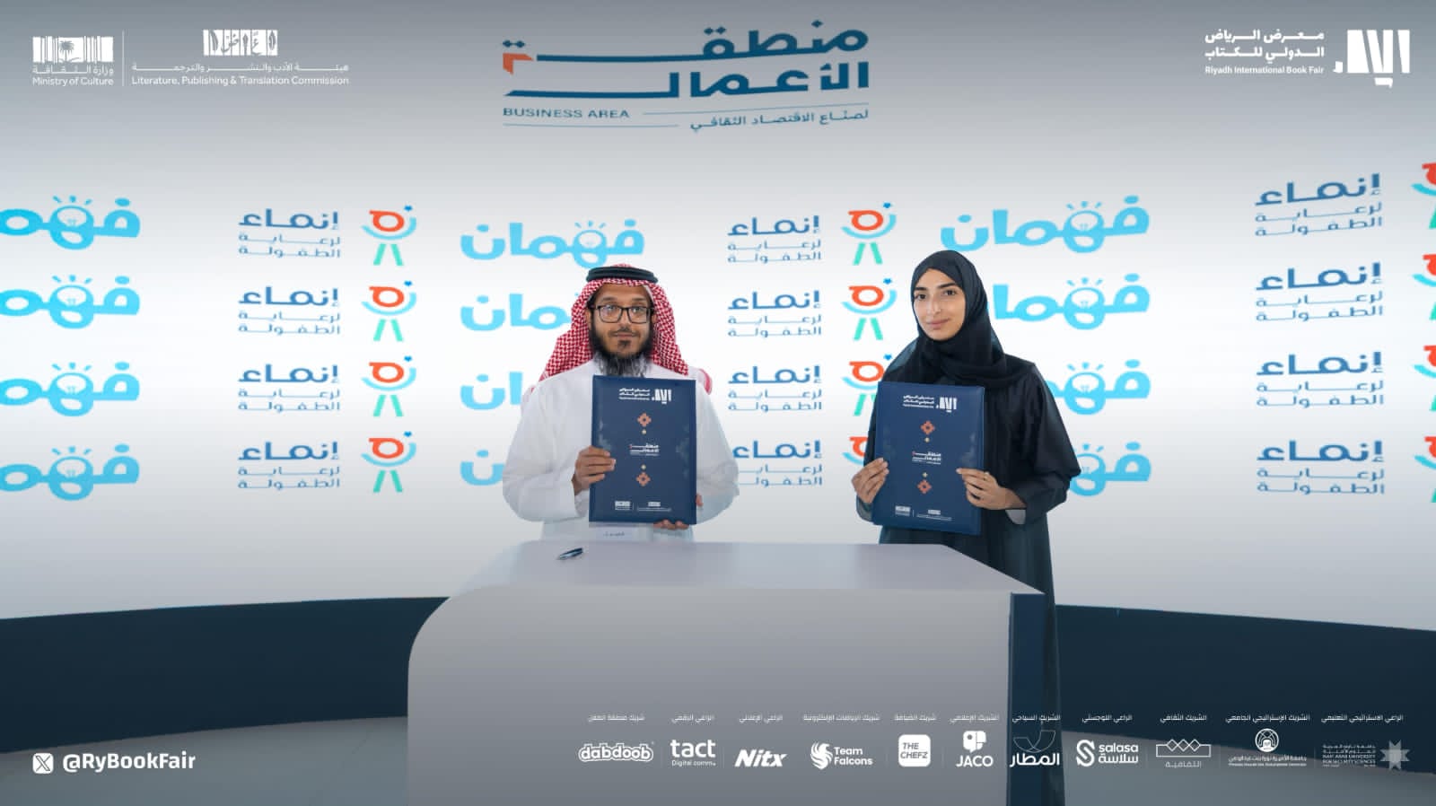 شهدت منطقة الأعمال في معرض الرياض الدولي للكتاب 2025 توقيع ميثاق شراكة بين جمعية إنماء لرعاية الطفولة وتطبيق فهمان، وأعلنا عن إطلاق مبادرة "مليون طفل قارئ في المملكة".