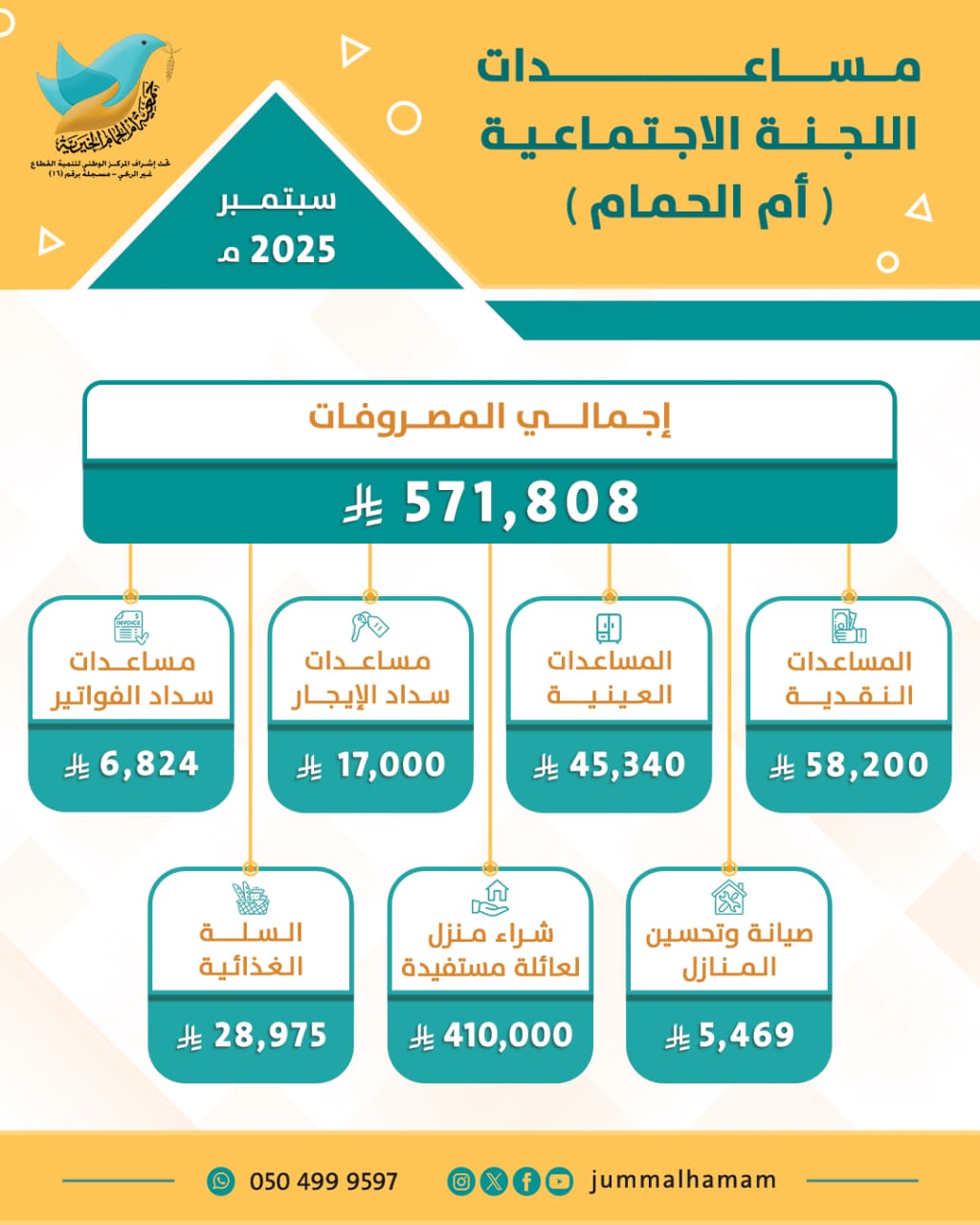 تجاوزت مصاريف مساعدات البرامج والأنشطة الاجتماعيّة في جمعيّة أمّ الحمام الخيريّة للخدمات الإنسانيّة خلال شهر سبتمبر 2025م، نصف مليون ريال، وذلك بإجماليّ مبلغٍ قدره (631043 ريال) ستمئة وواحد وثلاثون ألفاً وثلاثة وأربعون ريالاً، حيث توزّع المبلغ على برامج وأنشطة الجمعيّة المتعدّدة، والمساعدات العينيّة والنقديّة الدائمة والمقطوعة للمستفيدين من المحتاجين وذوي الدخل المحدود وعوائل أسر الأيتام.
