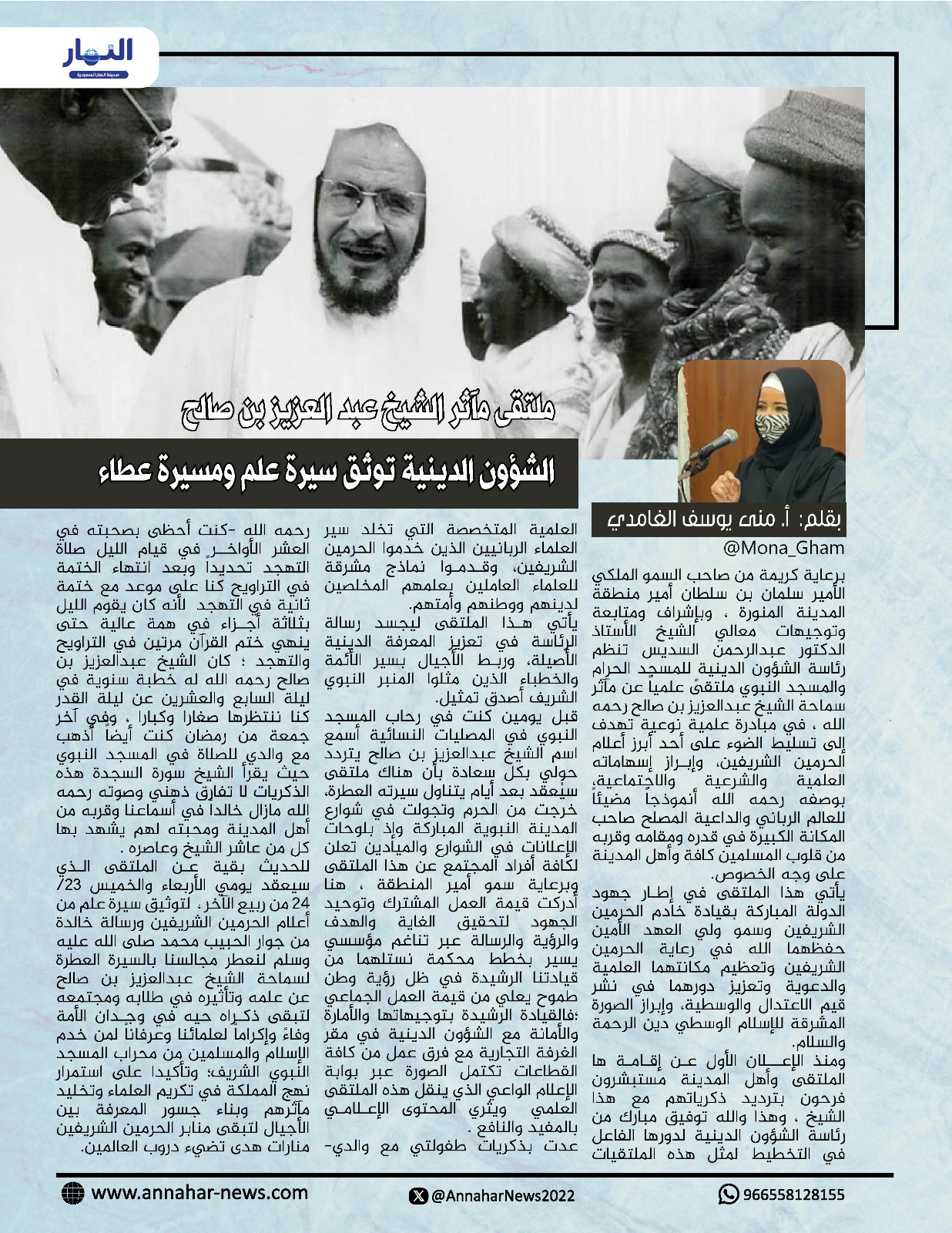 قبل يومين كنت في رحاب المسجد النبوي في المصليات النسائية أسمع اسم الشيخ عبد العزيز بن صالح يتردد حولي بكل سعادة بأن هناك ملتقى سيعقد بعد أيام يتناول سيرته العطرة، خرجت من الحرم وتجولت في شوارع المدينة النبوية المباركة وإذ بلوحات الإعلانات في الشوارع والميادين تعلن لكافة أفراد المجتمع عن هذا الملتقى وبرعاية سمو أمير المنطقة، هنا أدركت قيمة العمل المشترك وتوحيد الجهود لتحقيق الغاية والهدف والرؤية الرسالة عبر تناغم مؤسسي يسير بخطط محكمة نستلهما من قيادتنا الرشيدة في ظل رؤية وطن طموح يعلي من قيمة العمل الجماعي : فالقيادة الرشيدة بتوجيهاتها والأمارة والأمانة مع الشؤون الدينية في مقر الغرفة التجارية مع فرق عمل من كافة القطاعات تكتمل الصورة عبر بوابة الإعلام الواعي الذي ينقل هذه الملتقى العلمي ويثري المحتوى الإعلامي بالمفيد والنافع .