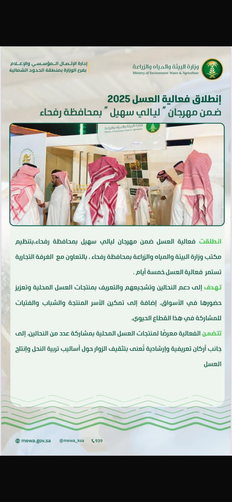 انطلقت فعالية العسل ضمن مهرجان ليالي سهيل بمحافظة رفحاء بتنظيم مكتب وزارة البيئة والمياه والزراعة بمحافظة رفحاء بالتعاون مع الغرفة التجارية تستمر فعالية العسل خمسة ايام.