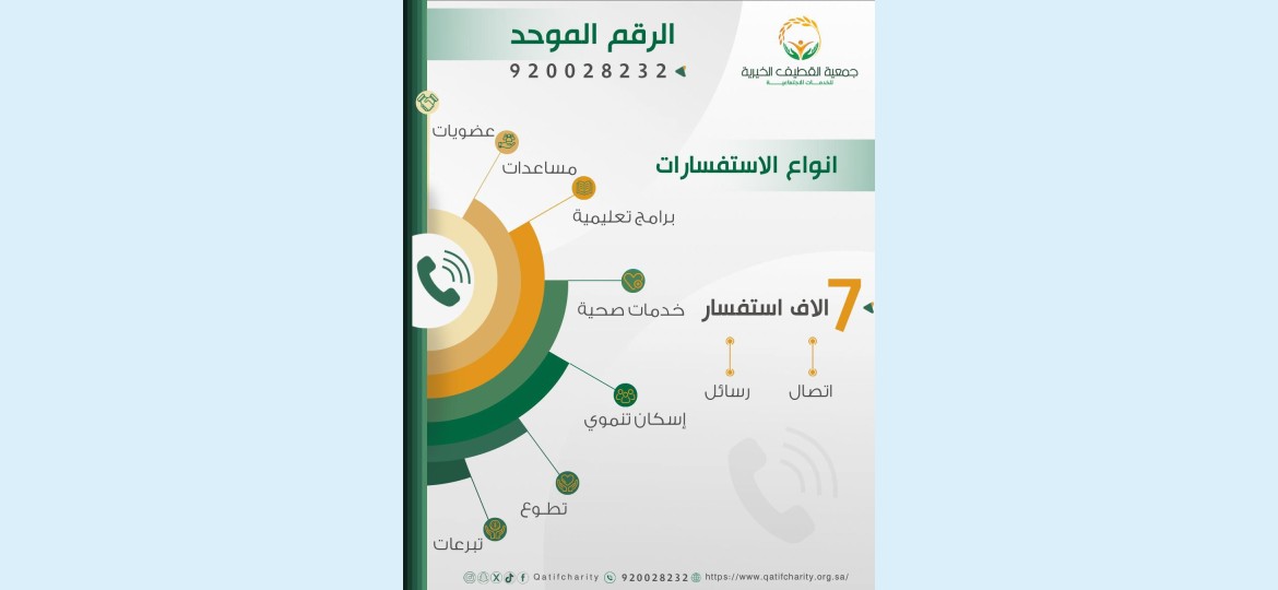 استقبل الرقم الموحد لجمعية القطيف الخيرية (920028232) والذي يعتبر أحدث وسائل التواصل التي اطلقتها الجمعية أكثر من 7 آلاف استفسار مند اطلاقه أواخر عام 2024 لتعزيز التواصل مع مستفيدي وداعمي الجمعية، والجمهور العام.