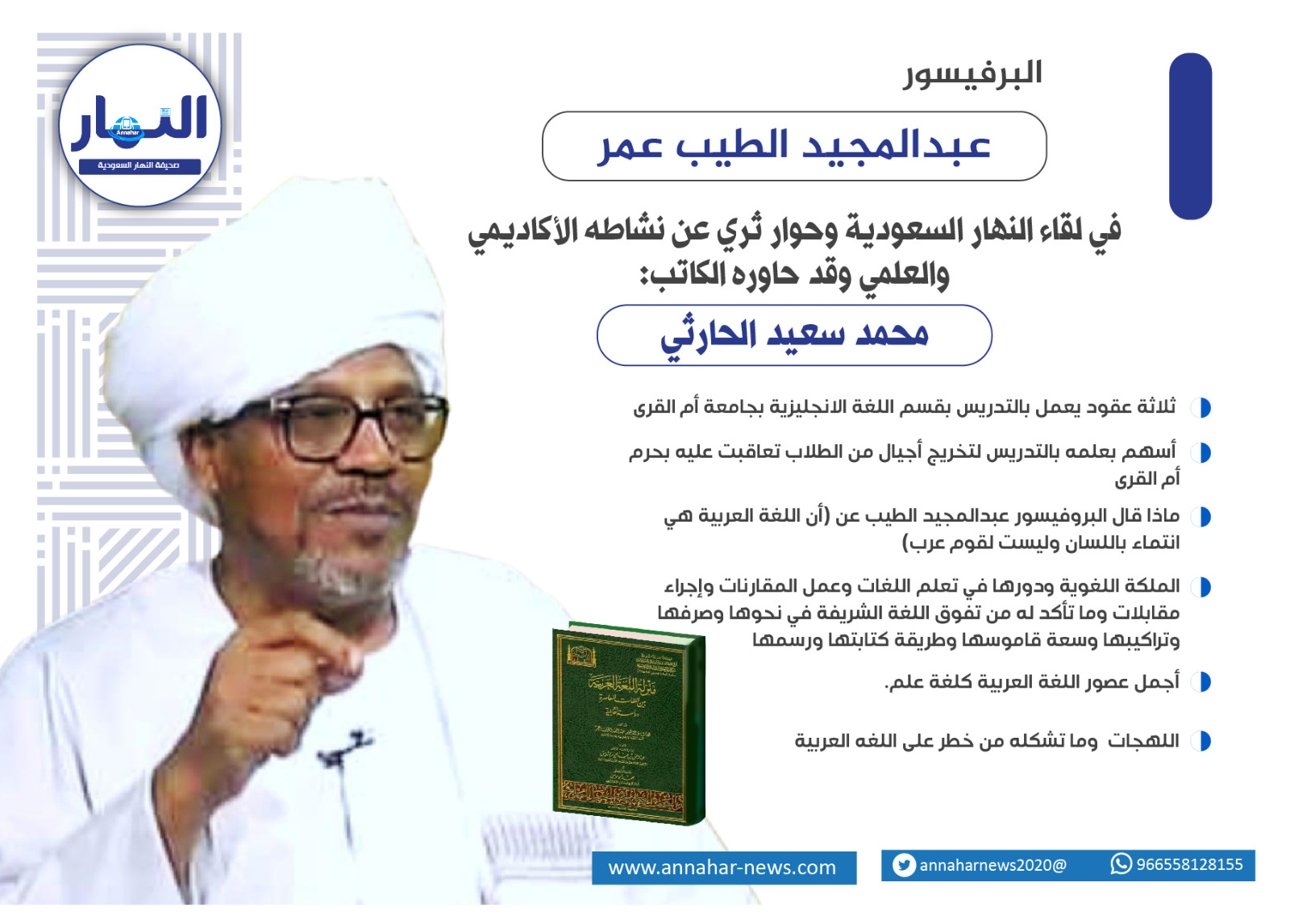 قامة سامقة مثل النخلة بأرض العرب مثمرة وشهية برطبها هو كذلك البروفيسور عبدالمجيد الطيب عمر تنهل من علمه ومن ثقافته وتجربته في الحياة من خلال رحلة علمية ثرية بدء من دراسته بوطنه السودان من مسقط رأسه مدينه عرب بالجزيرة الخضراء حين كان فتى يافعا يتقد ذكاءا متفوقا في دراسته ليغادر وطنه في أواخر السبعينات الميلادية بعد حصولة على الدرجة الجامعية وبتفوق تخصص اللغة العربية واللغة الإنجليزية لإستكمال رحلته العلمية ليمر من خلالها بمحطات متعددة في طلب العلم بدءً من بيروت إلى ويلز ببريطانيا ليحصل على درجة الدكتوراه من جامعة ويلز في "علم اللغة التطبيقي" ومنها للجامعات الامريكية أشهرها هارفارد العريقة وهذه الفترة كانت خلال الثمانينيات الميلادية ليعود لأرض الوطن للعمل به ليرد له الجميل ليستأنف رحلته إلى مكه حيث عمل بالتدريس بقسم اللغة الإنجليزية بجامعة أم القرى لمدة ثلاثة عقود أسهم بعلمه الغزير بتخريج اجيال من الطلاب تعاقبت عليه بحرم الجامعة وأدى رسالته بإخلاص وأمانة حينها آن لهذه القامة العلمية ان تستريح من العمل الأكاديمي ولكنها ألفت محراب العلم والذي كما يقال مجازا عبادة وهذا ديدن علماء السلف الأجلاء ليعكف على مشروع علمي مؤلفا جديدا لم يرى النور ليضاف إلى منجزه المهم للمكتبات العربية وهو "منزلة اللغة العربية من اللغات المعاصرة دراسة تقابلية " يطيب لصحيفة النهار السعودية إستضافة البروفيسور عبدالمجيد الطيب عمر في هذا الحوار الثري عن نشاطه في هذا المضمار والذي كان كريما معنا متواضعا في تلبية هذه الدعوة والذي تجسد فيه قول الشاعر في هذا البيت: