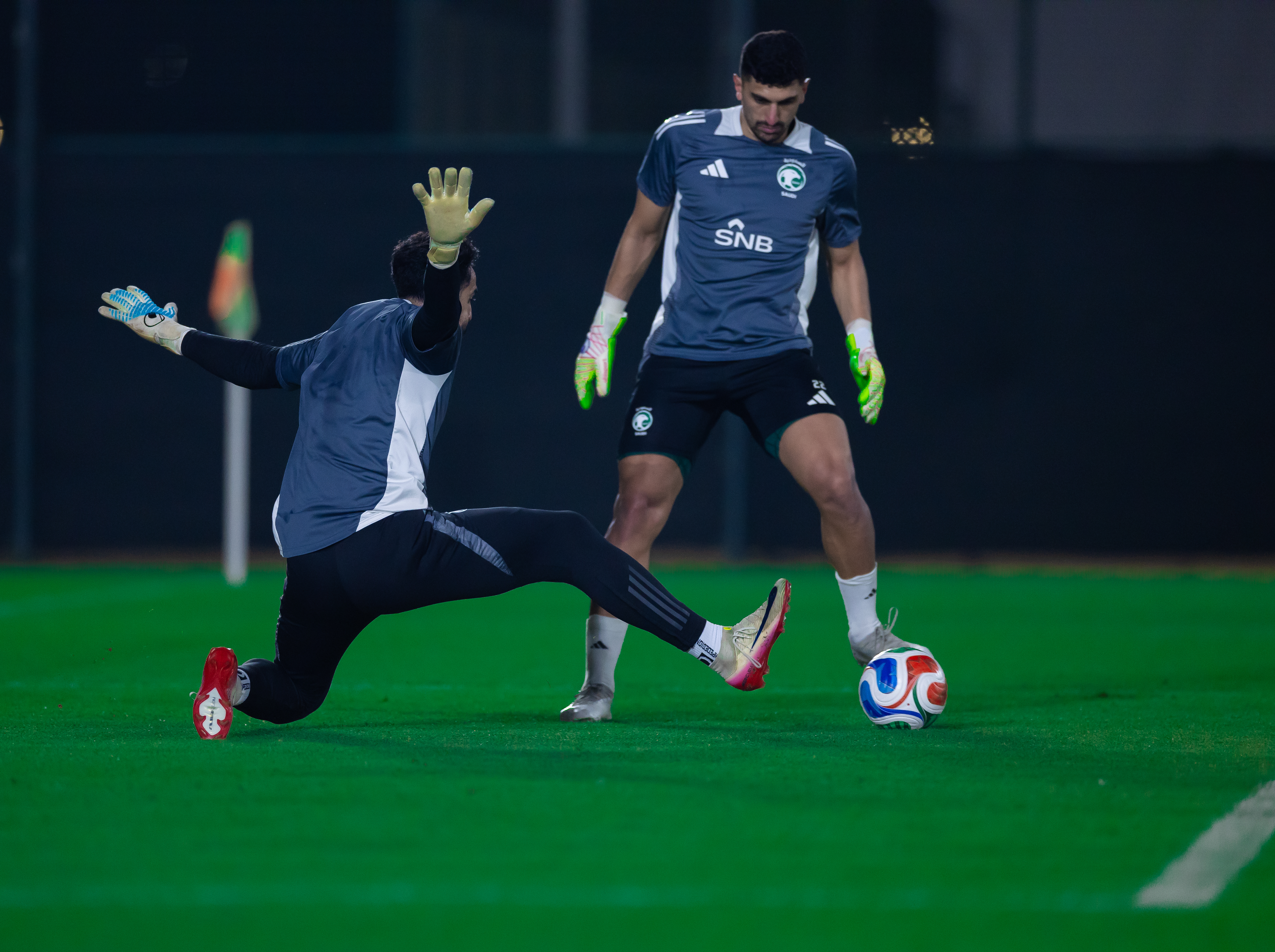 وأجرى لاعبو الأخضر حصتهم التدريبية على الملعب الرديف بمدينة الملك عبدالله الرياضية، تحت إشراف المدير الفني إيرڤي رينارد، حيث بدأت بتمارين الإحماء، تلتها تمارين الاستحواذ، ثم طُبِّقت تمارين تكتيكية متنوعة، قبل أن تُجرى مناورة على كامل مساحة الملعب.