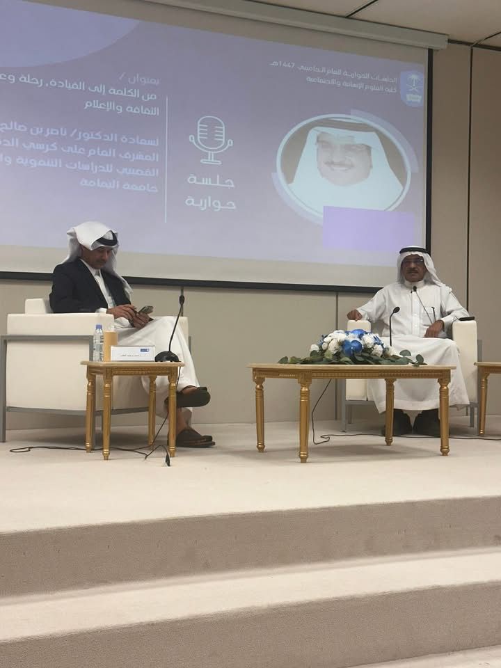 نظمت كلية العلوم الإنسانية والاجتماعية بجامعة الملك سعود اليوم جلسة حوارية متميزة استضافت خلالها سعادة الدكتور ناصر الحجيلان، وكيل وزارة الإعلام والمشرف على كرسي غازي القصيبي للدراسات الثقافية والتنموية بجامعة اليمامة. وأدار الجلسة الدكتور حسن الفيفي، حيث شهدت نقاشات ثرية تناولت أبرز القضايا الثقافية والتنموية، مستعرضة أبعاد الإعلام المعاصر ودوره في تعزيز الثقافة والمساهمة في التنمية المستدامة، بما يعكس دور الجامعات كمحاور فاعلة في صناعة الفكر وصياغة التجارب المجتمعية.