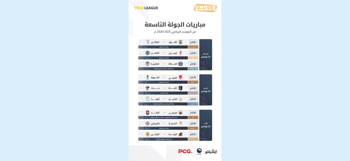 تنطلق يوم الجمعة منافسات الجولة التاسعة من دوري يلو لأندية الدرجة الأولى بعد توقف دام قرابة أسبوعين بسبب أيام الفيفا، حيث تعود الإثارة مجددًا وسط منافسة محتدمة على مراكز الصدارة وملاحقة الهروب من القاع.