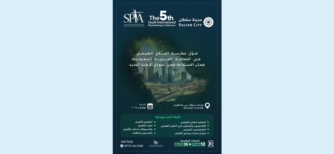 تنظم الجمعية السعودية للعلاج الطبيعي المؤتمر السعودي الدولي الخامس للعلاج الطبيعي بعنوان:"تحويل ممارسات العلاج الطبيعي في المملكة العربية السعودية: ضمان الاستدامة ضمن نموذج الرعاية الصحية الجديد" في مدينة سلطان بن عبدالعزيز للخدمات الانسانية في الفترة من ٢٧ الى ٢٩ نوفمبر ٢٠٢٥ م .