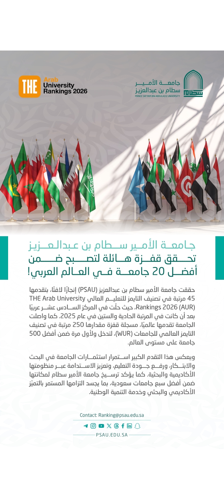 سجلت جامعة الأمير سطام بن عبدالعزيز تقدماً نوعياً في تصنيف التايمز للتعليم العالي للجامعات العربية (THE Arab University Rankings 2026)، حيث قفزت (45) مرتبة لتحتل المركز السادس عشر عربياً في تصنيف الجامعات العربية، بعد أن كانت في المرتبة الحادية والستين في تصنيف عام 2025.